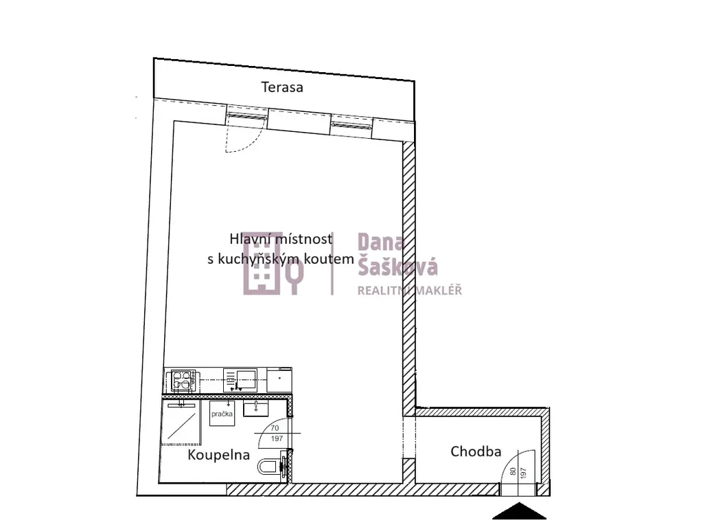 Byt orientovaný na severozápad je vybavený kuchyňskou linkou, elektrickou troubou, varnou deskou a digestoří.