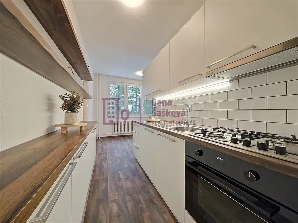 Kuchyně je vybavena linkou s plynovou varnou deskou, troubou a digestoří.