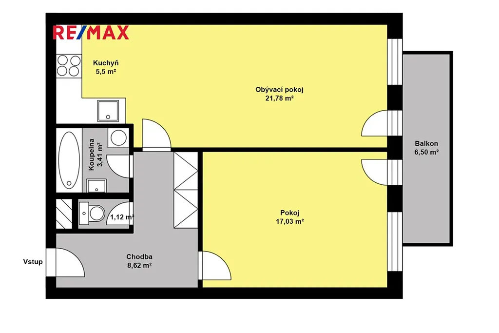 Dispozice zahrnuje obývací pokoj 21,78 m² s kuchyňským koutem 5,33 m², přímý vstup na balkon 6,5 m² z obývacího pokoje i ložnice 17,03 m², který je ideální k relaxaci nebo ranní kávě. Balkon je orientován na JZ. Byt má prostornou chodbu 8, 62 m², koupelnu 3,41 m² s vanou, samostatné WC 1,12 m². K bytu náleží sklepní kóje v suterénu bytového domu.