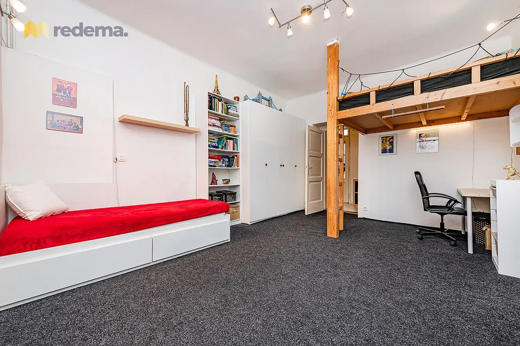 Byt nabízí dvě dětské místnosti (~16 a ~22 m²), které jsou mezi sebou propojené, přičemž každá má vlastní vstup. Jedna z nich je navíc doplněna o prakticky vybudované patro, které skvěle využívá výšku stropu a poskytuje dětem další prostor na spaní nebo hraní.
