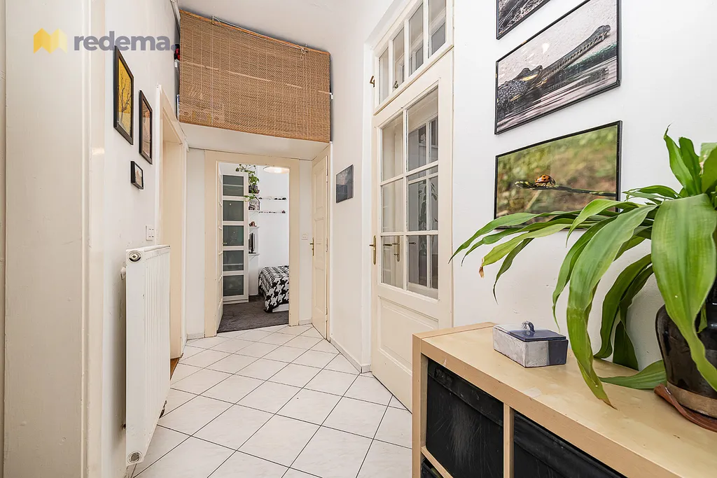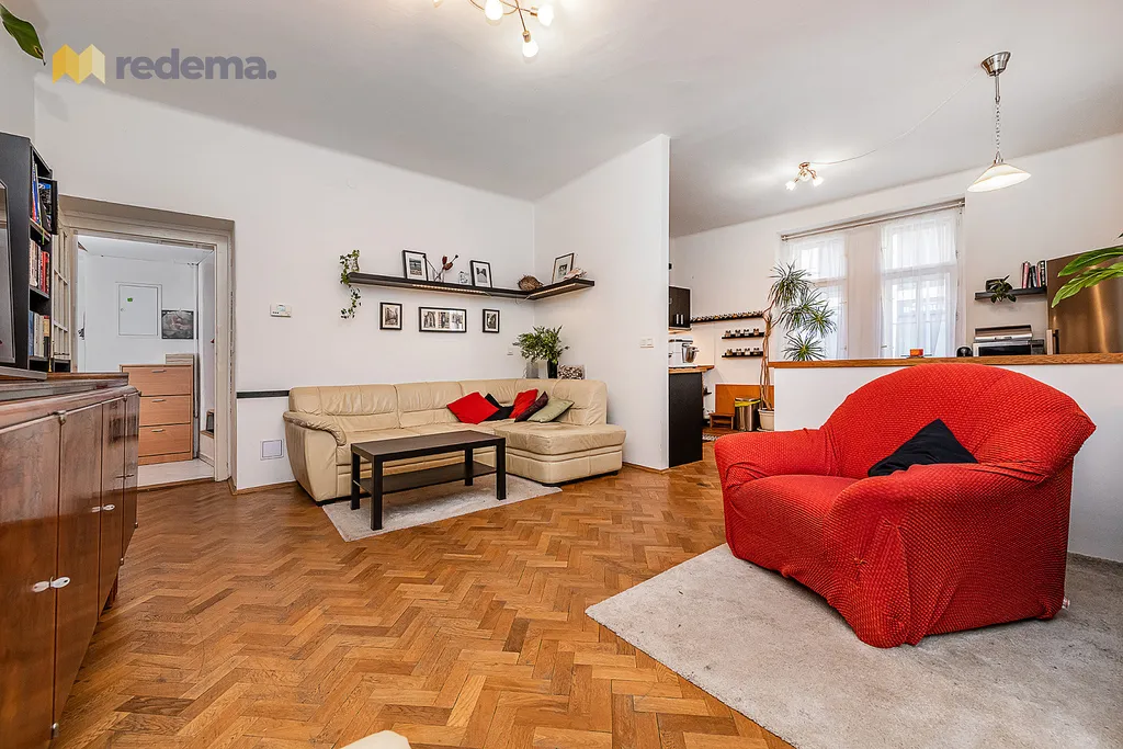 Původní dispozice 3+1 prošla citlivou rekonstrukcí a byla upravena na velmi efektivní 4+kk. Interiér působí vzdušně a elegantně, k čemuž významně přispívají vysoké stropy. Dominantou bytu je velkorysý obývací pokoj propojený s kuchyní a jídelnou (s plochou zhruba 39 m²), který tvoří přirozené centrum celého domova – ideální prostor pro rodinný život i setkávání s přáteli.