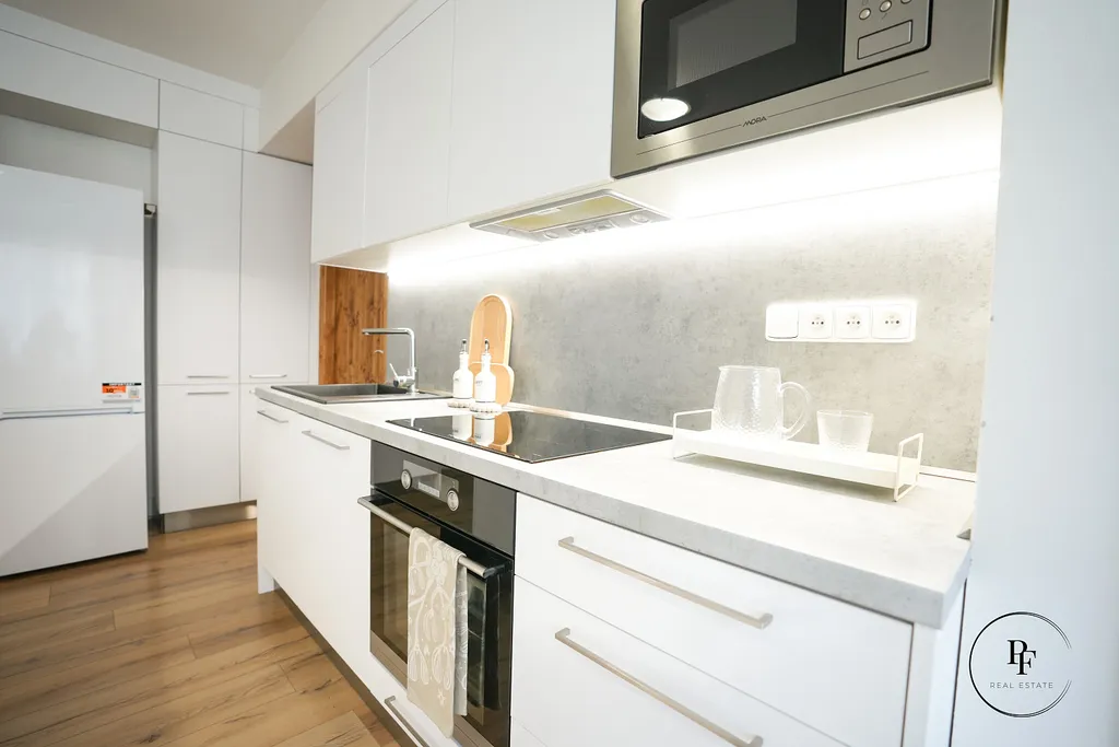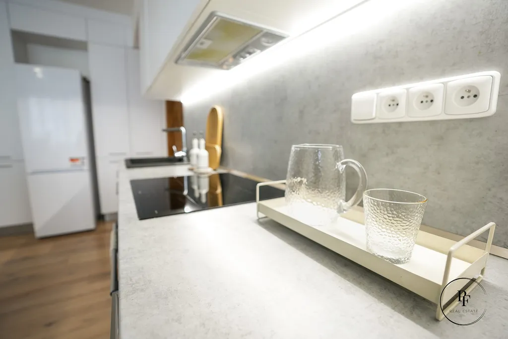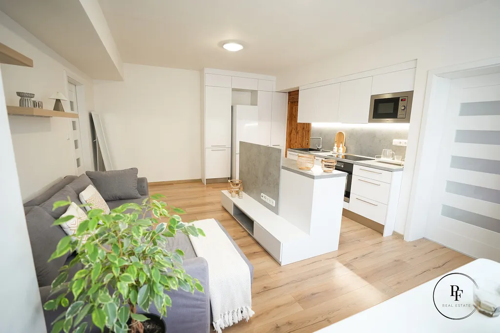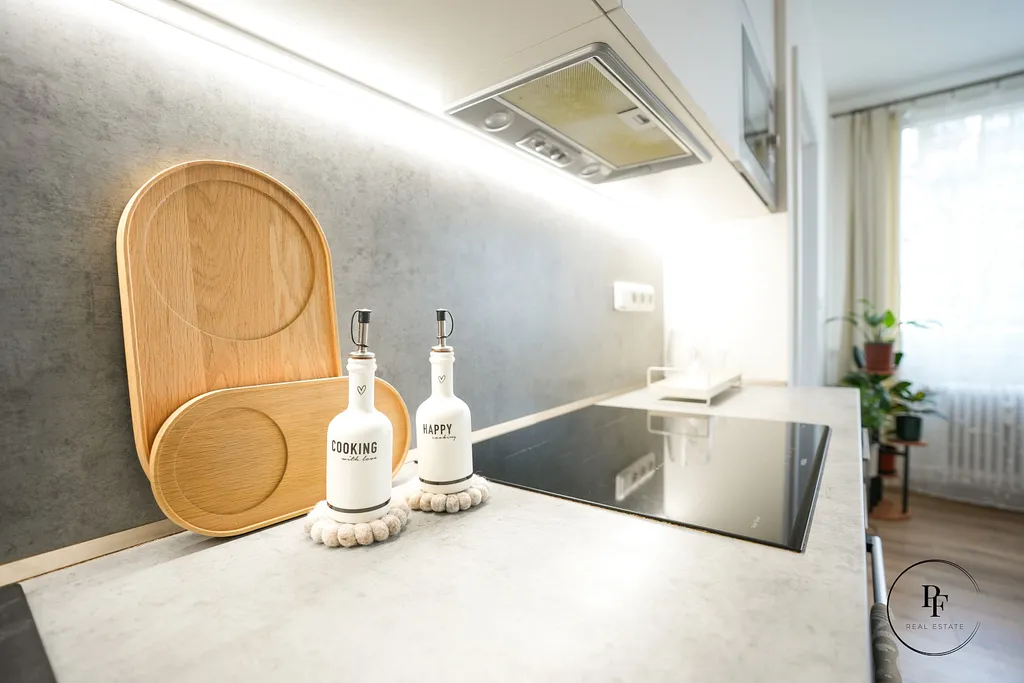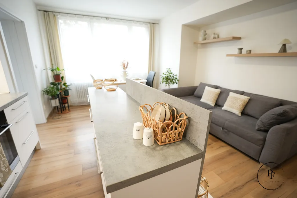 Obývací pokoj je propojen s moderní kuchyňskou linkou a ostrůvkem. Kuchyně je vybavena vestavěnou myčkou, mikrovlnnou troubou, varnou deskou a troubou a nabízí dostatek pracovní i úložné plochy. Z obývacího pokoje se vstupuje do dvou samostatných ložnic, které lze využít jako hlavní ložnici, dětský pokoj nebo pracovnu.
