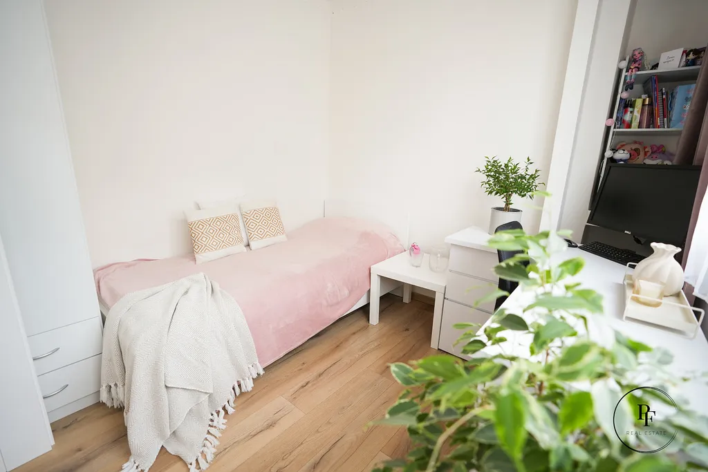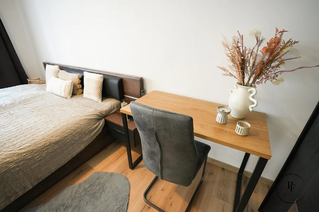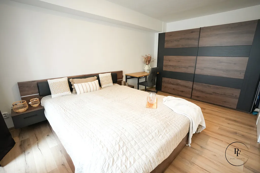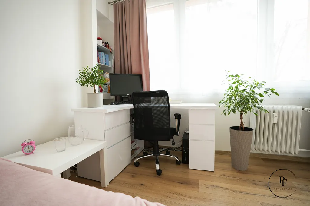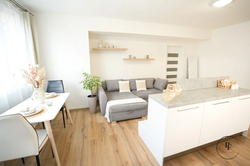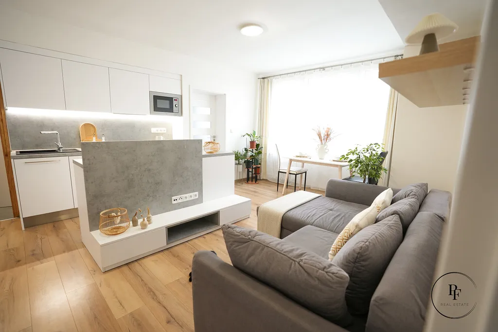 Obývací pokoj je propojen s moderní kuchyňskou linkou a ostrůvkem. Kuchyně je vybavena vestavěnou myčkou, mikrovlnnou troubou, varnou deskou a troubou a nabízí dostatek pracovní i úložné plochy. Z obývacího pokoje se vstupuje do dvou samostatných ložnic, které lze využít jako hlavní ložnici, dětský pokoj nebo pracovnu.