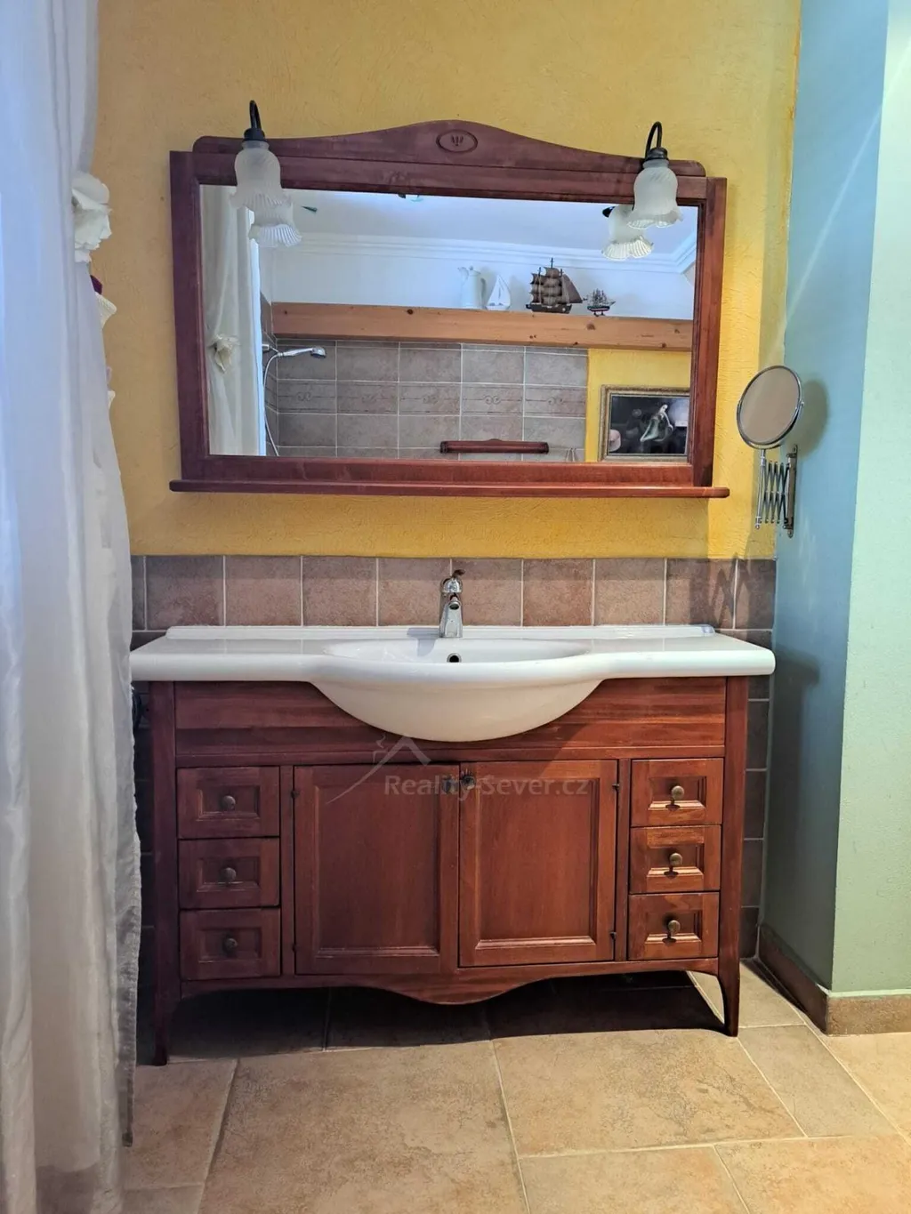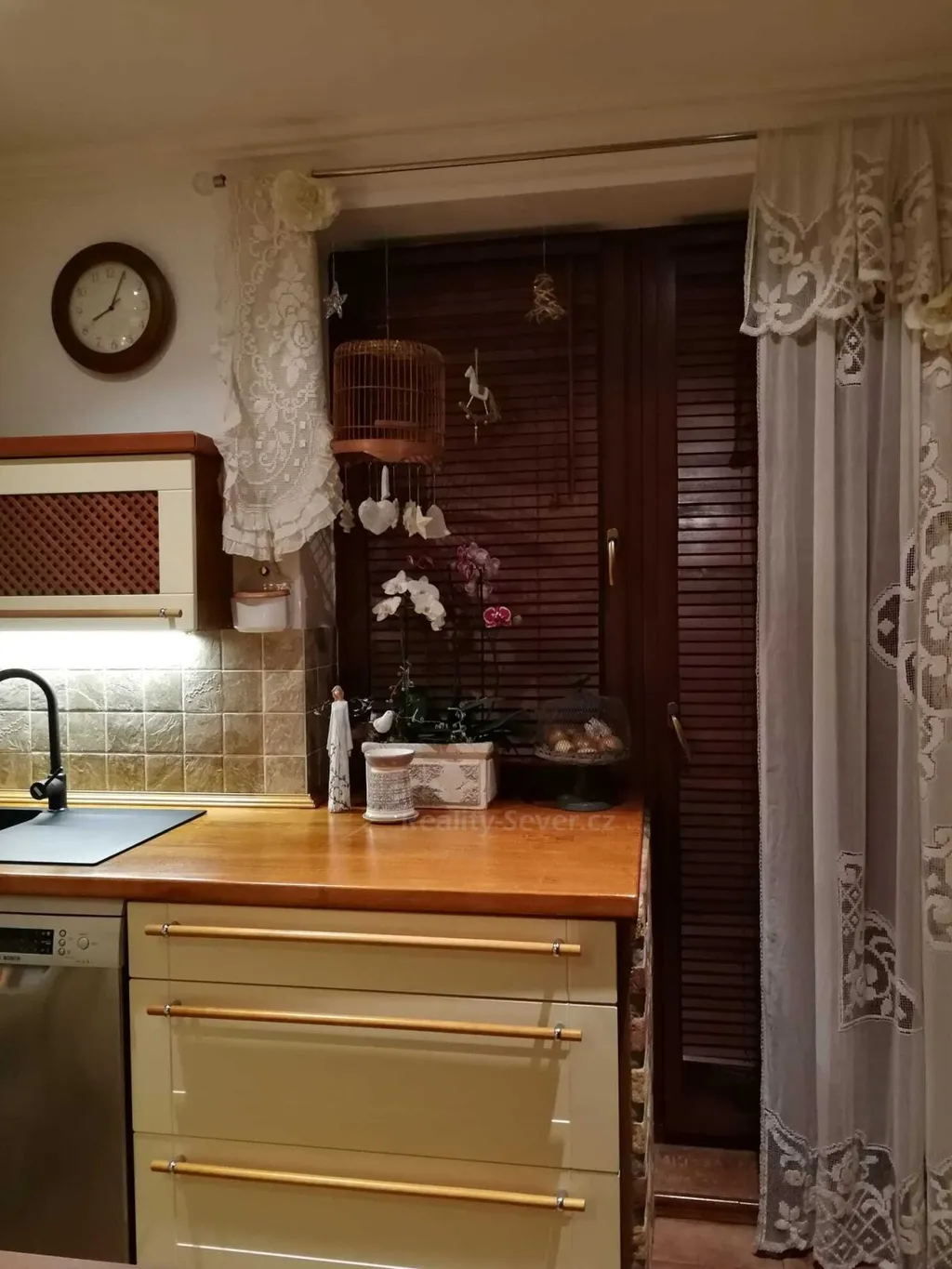 Přes zádveří vejdete do chodby s WC, vstupem do sklepa. Dále je pak kuchyně s východem na zahradu, jídelna, obývák s výklenkem a kachlovými krbovými kamny s výměníkem na vodu. Přikládání do kamen je řešeno z chodby, takže obývák zůstává čistý a bez zápachu. V tomto podlaží je v kuchyni podlahové topení napojené na ústřední plynové topení a na WC je podlahové topení elektrické. V jídelně je původní borovicová podlaha a v obýváku původní dubová parketová podlaha. Obě ve výborném stavu.