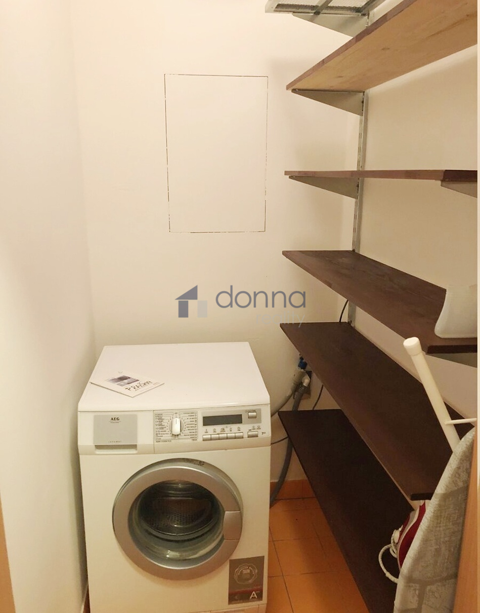 Byt je kompletně zařízený nábytkem a spotřebiči. V koupelně je vana a toaleta. Topení ústřední.