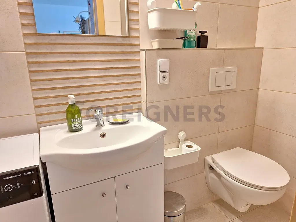 - v koupelně najdete sprchový kout, pračku, umyvadlo se úložnou skříňkou včetně zrcadla a WC