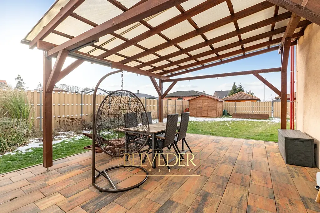 O příjemné vnitřní klima se stará klimatizace v obývacím pokoji, která zajišťuje vytápění celého bytu. Díky kvalitnímu zateplení domu je bydlení energeticky úsporné a provozně nenáročné. Velkým benefitem je prostorná terasa o výměře 40 m² s pergolou o velikosti 25 m², které poskytují ideální prostor pro rodinná posezení, grilování nebo oslavy. Zahrada o celkové výměře 301 m² nabízí dostatek místa pro dětské hry, bazén, trampolínu i klidnou relaxaci.
