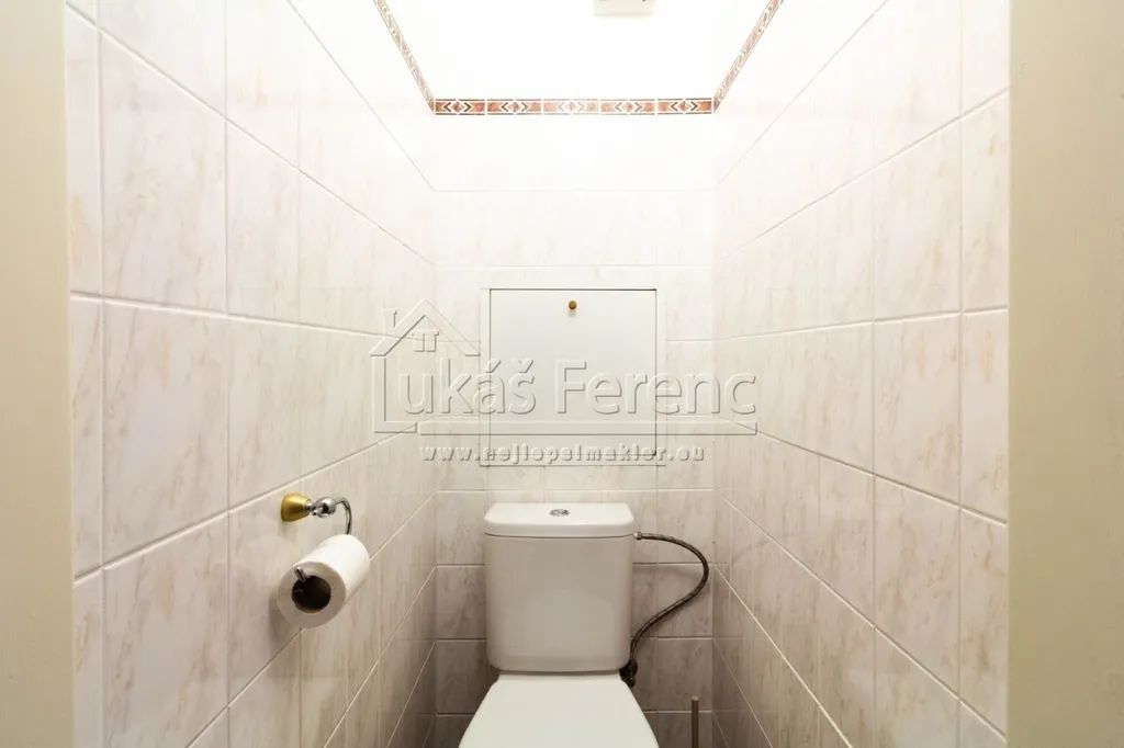 Velkou výhodou je nadstandardně prostorná koupelna s rohovou vanou, působící vzdušně a komfortně. WC je samostatné.
