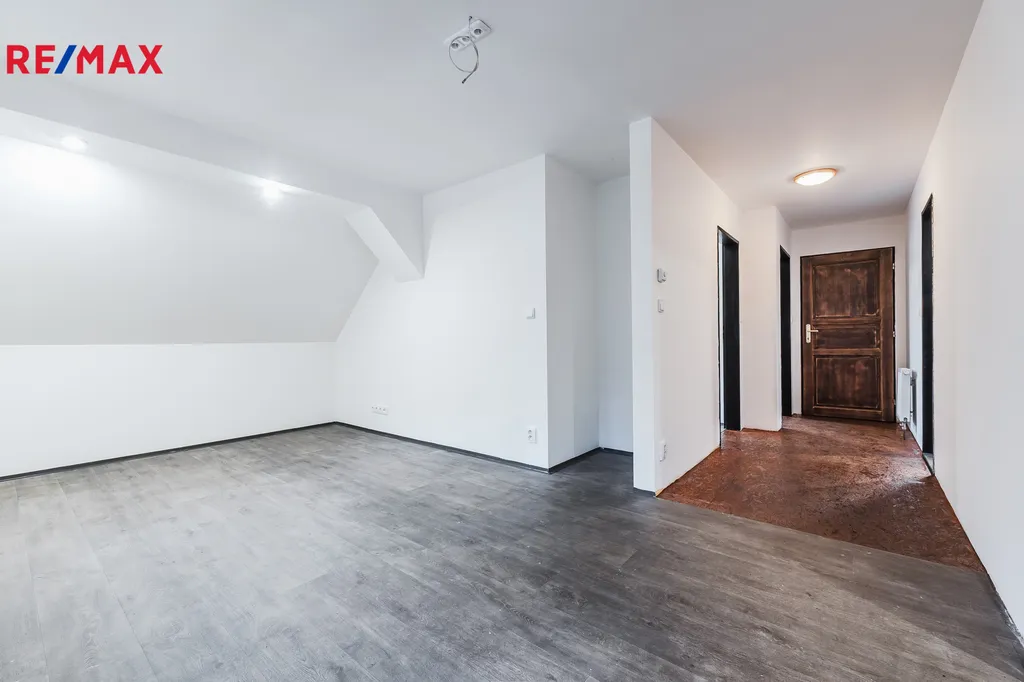 Prostory prvního nadzemního podlaží je možné uzpůsobit na trvalý pobyt a využít tak rozsáhlé prostory bývalé hospody.