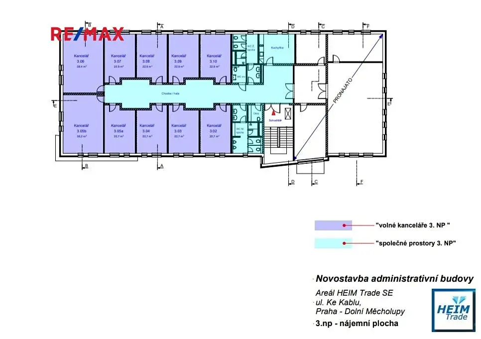 Nabízíme nové nevybavené prostory k pronájmu v Dolních Měcholupech (ulice Ke kablu) s okamžitou využitelností. Dohromady se jedná o deset kanceláří ve třetím nadzemním podlaží, které se dají pronajmout jako jeden celek, nebo jednotlivě. Společné prostory tvoří chodba/hala, kde se dá po domluvě s majitelem objektu dopronajmout extra prostor u zdí (tzv. niky), který se dá využít např. k trvalému umístění vestavených skříní či tiskáren atp. Další společné prostory tvoří toalety (dámské v bílé barvě a pánské v černé) a kuchyňka. Čtyři kanceláře mají totožnou rozlohu 23 m² a zbylé dvě větší pak každá cca 39 m².