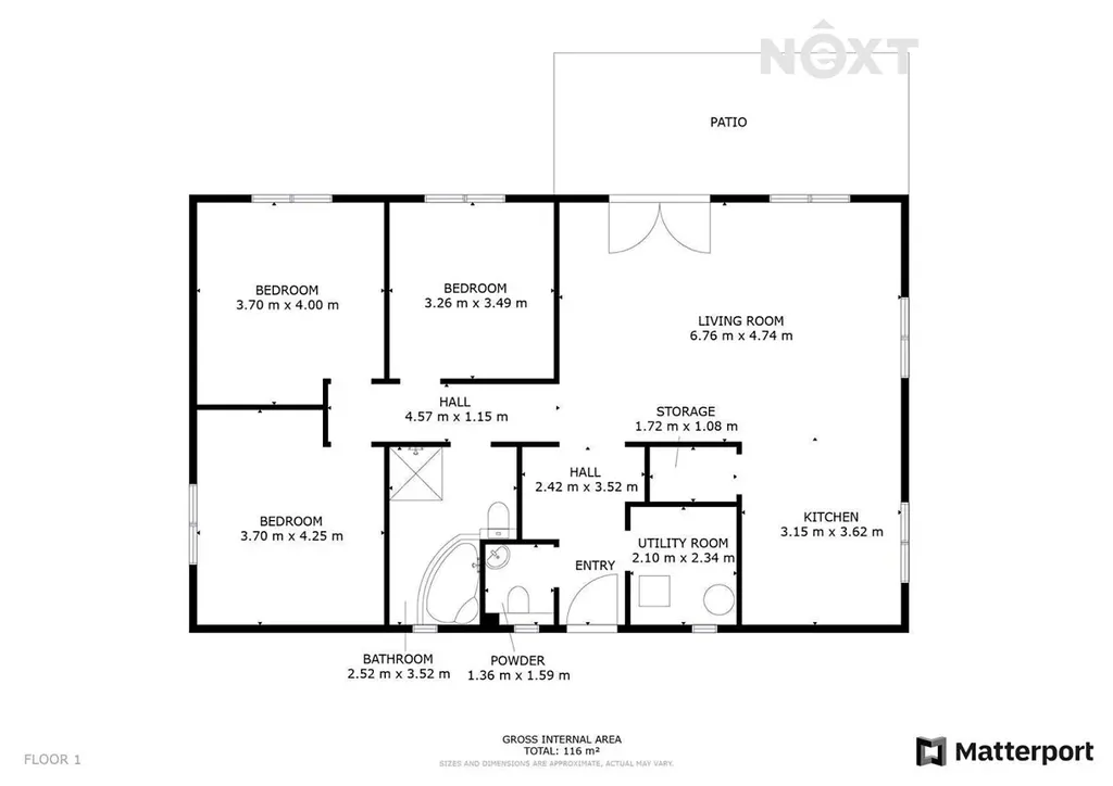 Interiér je navržen s logikou v praktičnost pro každodenní pohodlí rodiny. Při vstupu vás přivítá prostorná vstupní hala (8 m²), která navazuje na hlavní obytnou část – obývací pokoj (35 m²) propojený s kuchyní (12 m²). Kuchyňský kout je prakticky doplněn o komoru / spíž (2 m²). Z obývacího pokoje je přímý vstup na terasu (18 m²) a do zahrady, která nabízí dostatek prostoru pro relaxaci, rodinné chvíle i budoucí zahradní realizace dle vašich představ. Klidovou zónu domu tvoří tři samostatné ložnice / pokoje (16 m², 16 m² a 9 m²), které poskytují dostatek soukromí jak rodičům, tak dětem. Komfort bydlení podtrhuje koupelna o velikosti 12 m² vybavená sprchovým koutem i vanou, a samostatné WC (2 m²). Samozřejmostí je technická místnost (4 m²).