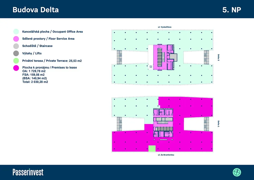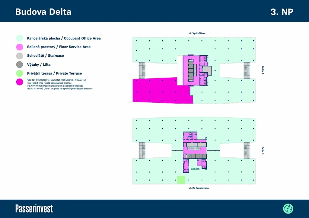 Nabízíme na pronájem prvotřídní kancelářské prostory o celkové ploše 1 320 m2 v 7. nadzemním podlaží administrativní budovy Delta, Za Brumlovkou 1559/5, Praha 4 – Michle. Prostory ve stávajícím fit outu jsou k dispozici ihned, úpravy možné dle dohody. Další prostory ihned k pronájmu v této budově se nacházejí v 5. NP (2 030 m2 – fit out) a ve 4. NP (599 m2 – open plan). Ve stávajícím fit outu jsou pak od května 2026 také k dispozici prostory ve 3. NP o ploše 915 m2. Delta, která je součástí lokality Brumlovka, má celkovou pronajímatelnou plochu 40 800 m2 v 8 nadzemních podlažích a 880 parkovacích míst v 5 podzemních podlažích. Nachází se v místě ohraničeném hlavní třídou Vyskočilova a ulicemi Václava Sedláčka a Za Brumlovkou. Deltu tvoří dvě samostatné budovy s velmi efektivním půdorysem ve tvaru dvou písmen H. Delta je navržena s maximálním ohledem na životní prostředí, k dispozici nájemcům jsou prostorné střešní terasy s bohatou zelení a relaxačními zónami. Západní část budovy lemuje zelený pás s umělým říčním korytem, na jižní stranu objektu volně navazuje Park Brumlovka. V přízemí budovy je restaurace a veřejná kantýna. Delta má vynikající dopravní dostupnost: autobusová zastávka přímo před budovou (dvě zastávky ke stanicím linky trasy C – Budějovická a Kačerov), přímé napojení na Pražský okruh a dálnici D1. Široká nabídka obchodů a služeb v lokalitě Brumlovky (restaurace, kavárny, veřejné kantýny, supermarket Albert, drogerie, zdravotnická zařízení, fitness a wellnes Balance Club Brumlovka, čistírna…), parky pro odpočinek a relaxaci a Náměstí Brumlovka s vodními prvky a posezením, kde se konají pravidelně trhy a společenské a kulturní akce. K hlavním nájemcům budovy Delta patří společnosti Hewlett Packard, HP INc. a Microsoft.