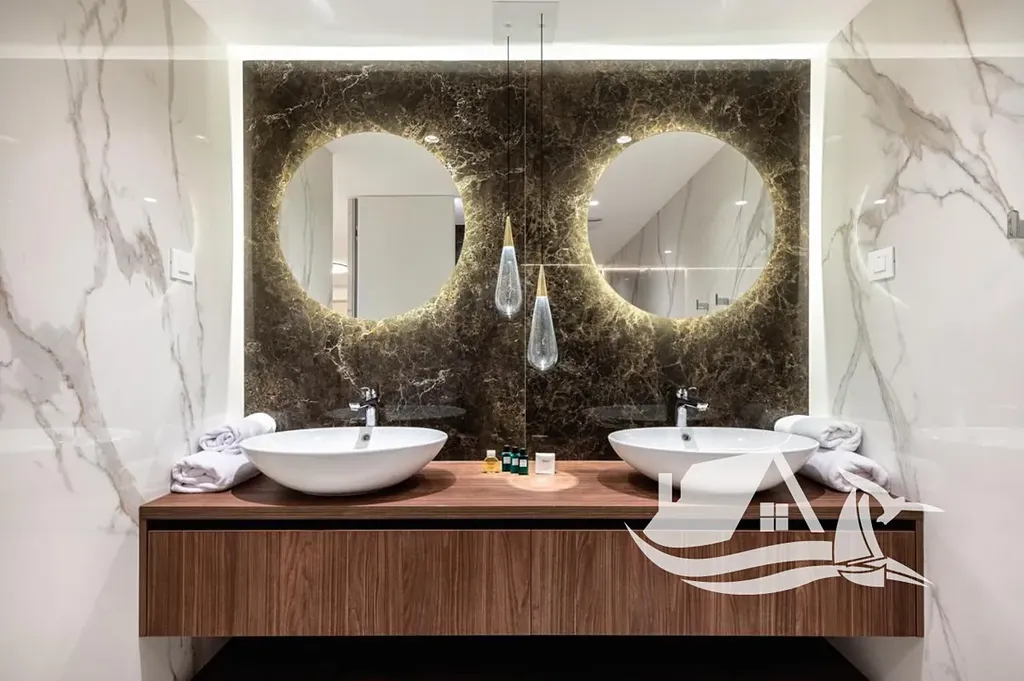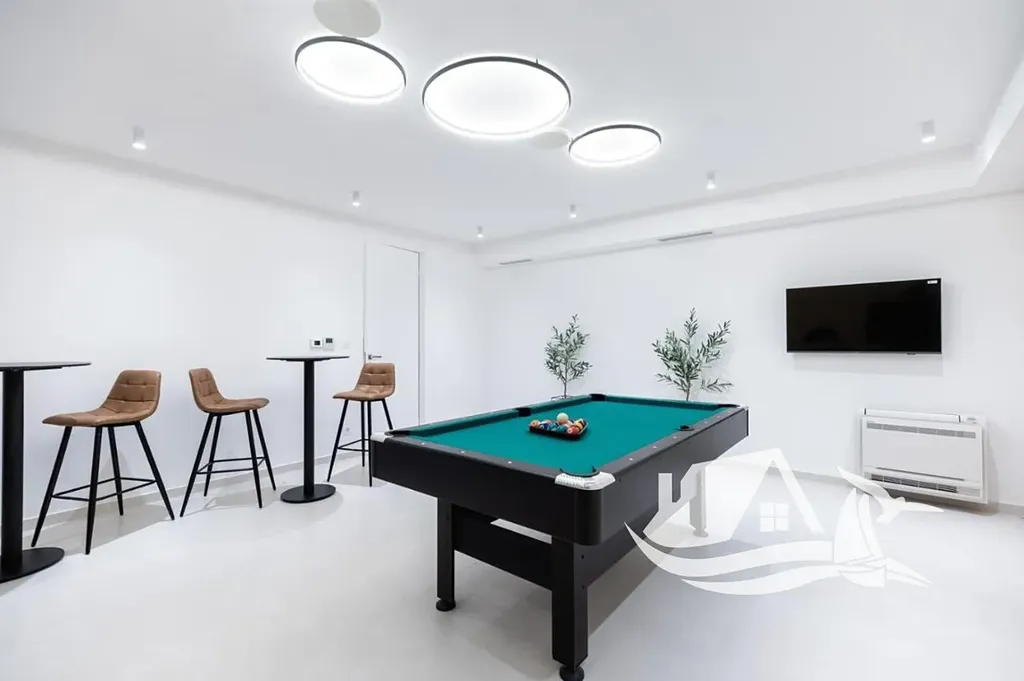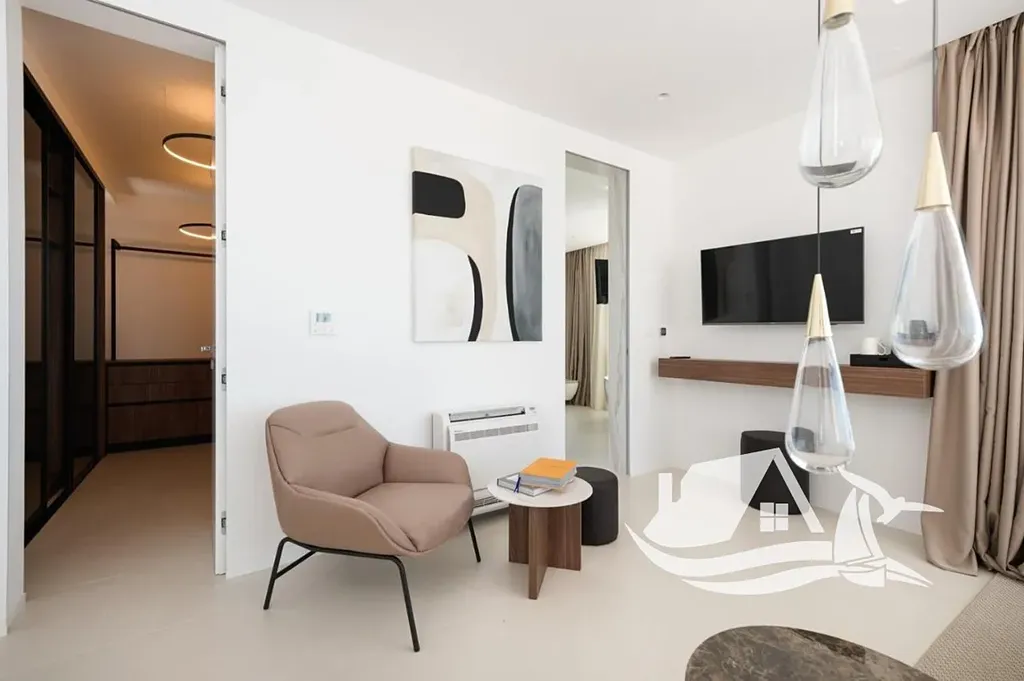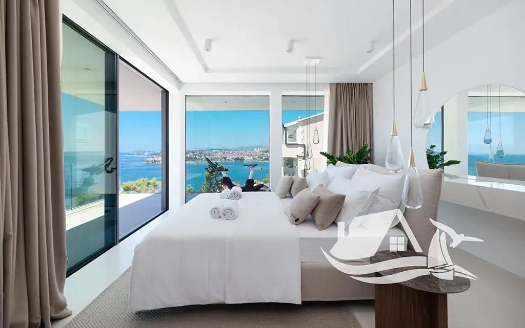 Interiér je zařízen luxusním nábytkem z Německa a Itálie, doplněným ručně vyráběným osvětlením, které podtrhuje exkluzivní charakter celé nemovitosti. Exteriér obklopuje pečlivě upravená zahrada s bazénem, vířivkou, sluneční terasou a venkovním barem. Na horním podlaží se nachází prostorná terasa s otevřeným výhledem na moře a ostrovy, ideální pro klidný odpočinek i soukromé večery.