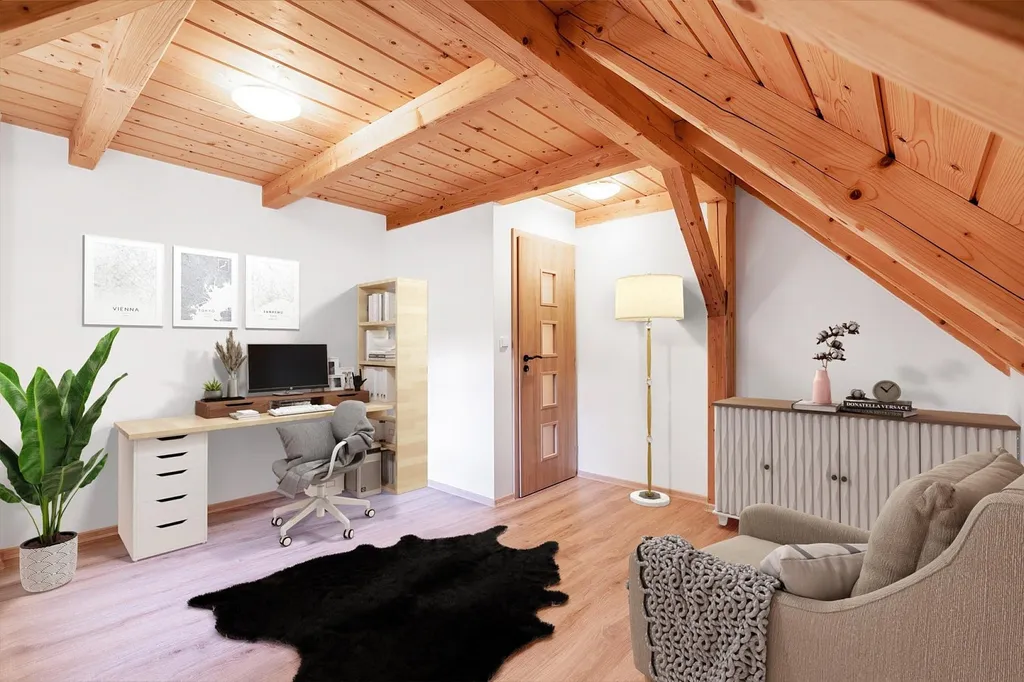 V horním patře se nachází tři prostorné ložnice, které nabízí dostatek místa pro celou rodinu. Součástí patra je také velká elegantní koupelna s působivým designem. A ve štítu domu oceníte překrásnou půdu, jež nabízí další možnosti využití prostoru.