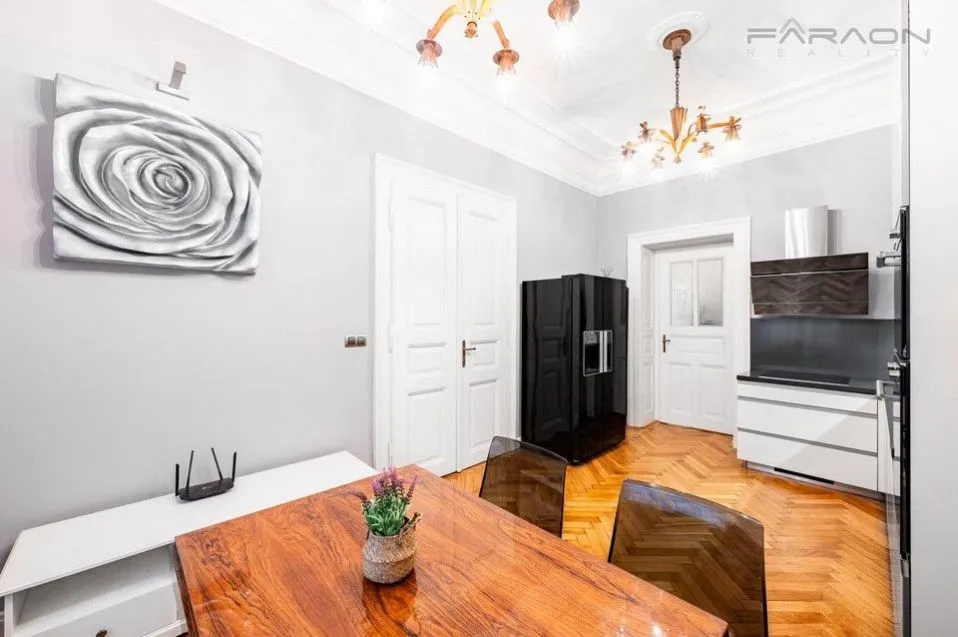 Nabízíme pronájem luxusního zařízeného bytu 2+1 80 m2 v těsné blízkosti Staroměstského náměstí a Pařížské ulice v Praze 1. Byt po kompletní rekonstrukci je situován ve čtvrtém patře secesního domu s designovým výtahem. Byt disponuje obývacím pokojem s kachlovými kamny, ložnicí s vířivou vanou a balkonem s výhledem do vnitrobloku, plně vybavenou kuchyní s jídelní částí a kuchyňskými spotřebiči Bauknecht, koupelnou se sprchovacím koutem, WC a vytápěnou podlahou, prádelnou s pračkou a sušičkou a vstupní halou s dekorativní dlažbou. Interiér umocňují vysoké stropy, velká repasovaná okna, masivní parkety v pokojích, původní designové osvětlení a obklady - Villeroy Boch. Bezpečnostní vstupné dveře, alarm, kamerový systém, kabelová TV, internet. Cena pronájmu: 49 000,- Kč / měsíc, poplatky: 7 000,- Kč / měsíc.