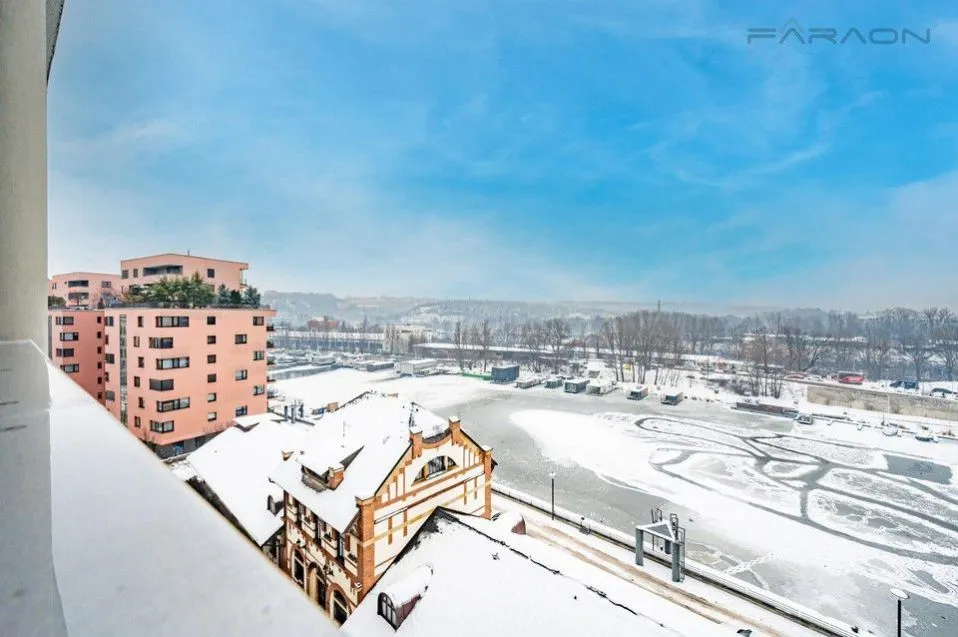 Dispozice bytu 2+kk zahrnuje otevřený prostor obývacího pokoje s kuchyní, jídelním prostorem a obývací částí (s přímým výstupem na terasu s výhledy), oddělenou od ložnice posuvnými dveřmi, ložnice s přímým vstupem na terasu s posezením a krásnými výhledy na řeku. Dále prostorná koupelna s vanou, vanou, závěsná toaleta. Vstupní hala se zabudovanými šatními skříněmi. V ceně nájmu parkovací místo a sklep.