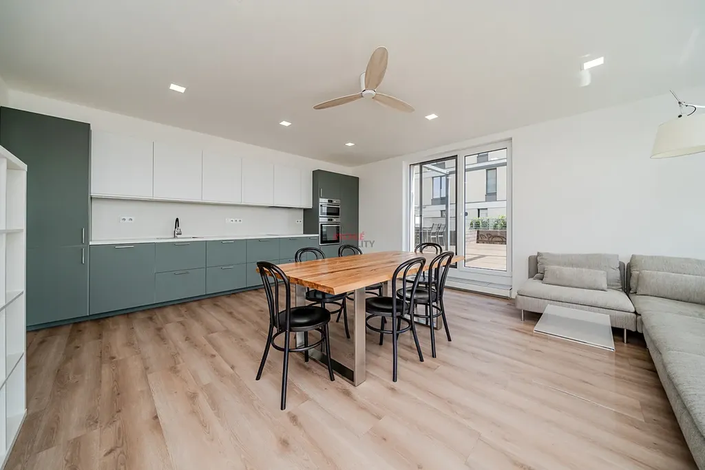 Kuchyňská linka je vybavena vestavnými spotřebiči, na podlahách je neutrální velkoformátová dlažba a vinylová plovoucí podlaha, terasa je ohraničena drátěnými truhlíky, které skýtají možnosti výsadby okrasných keřů, příp. zahradničení. Na všech oknech jsou venkovní předokenní elektrické žaluzie, obývací prostor je navíc vybaven výkonným stylovým stropním ventilátorem.
