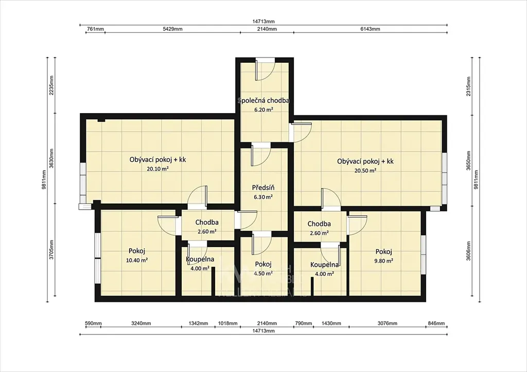 Dispozice nabízí předsíň, obývací pokoj s kuchyňským koutem, dva samostatné pokoje, chodbu a koupelnu s toaletou.