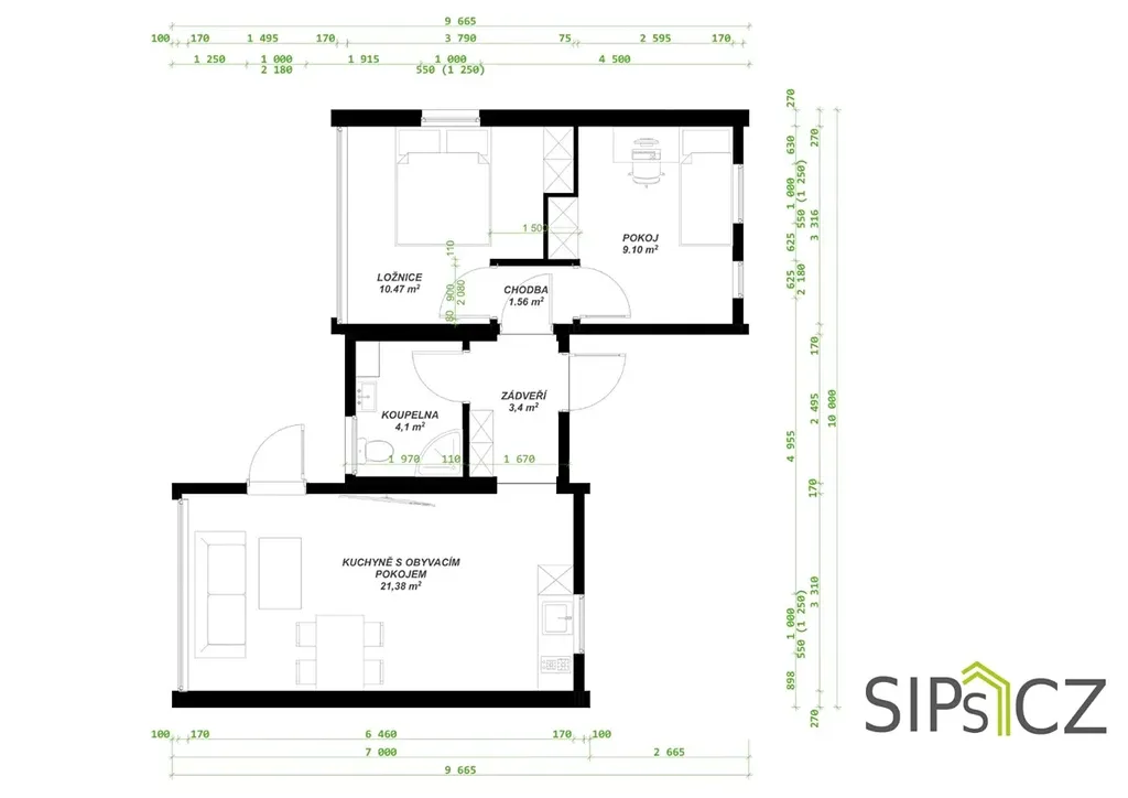 Dispozice: obývák s kuchyňským koutem 21,38m2, ložnice 10,47m2, dětský pokoj 9,1m2, koupelna a WC 4,1 m2, zádveří 3,4m2, chodba 1,56m2.