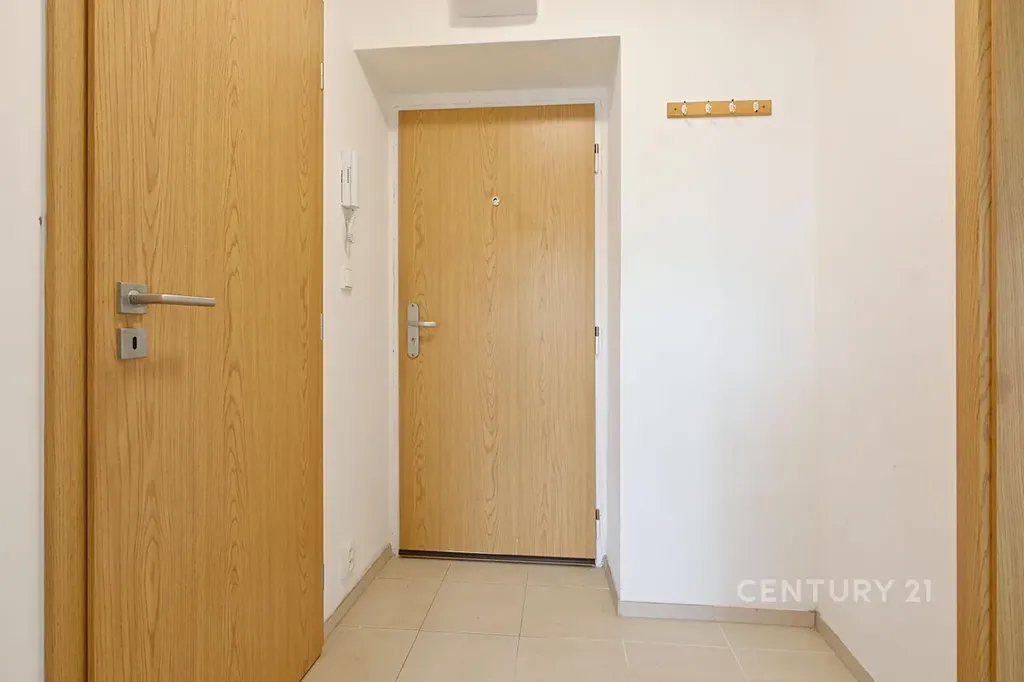Jakmile vstoupíme dovnitř, máme po pravé straně koupelnu se sprchovým koutem, otopným žebříkem a WC. V kuchyni se nachází kuchyňská linka s elektrickou troubou, varnou deskou a digestoří. V samostatném pokoji a kuchyni je položena plovoucí podlaha, v chodbě a koupelně je dlažba. Pokoj je na fotografii i vizualizován pro lepší představu jak by mohl zařízený vypadat. V bytě jsou plastová okna.