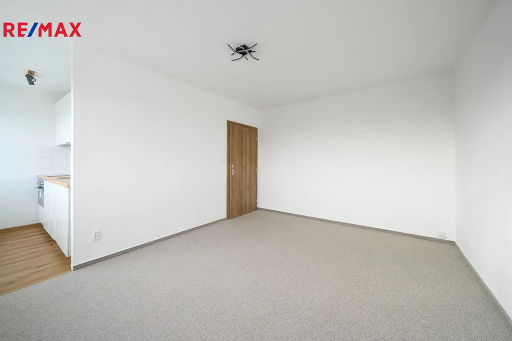 Dispozice bytu zahrnuje pokoj s kuchyňským koutem, koupelnu se sprchovým koutem a toaletou, předsíň a sklepní kóji. Kuchyňský kout je vybaven moderní kuchyňskou linkou se zabudovanými spotřebiči: elektrická trouba s mikrovlnnou funkcí, indukční varná deska, lednice s mrazákem a myčka nádobí.