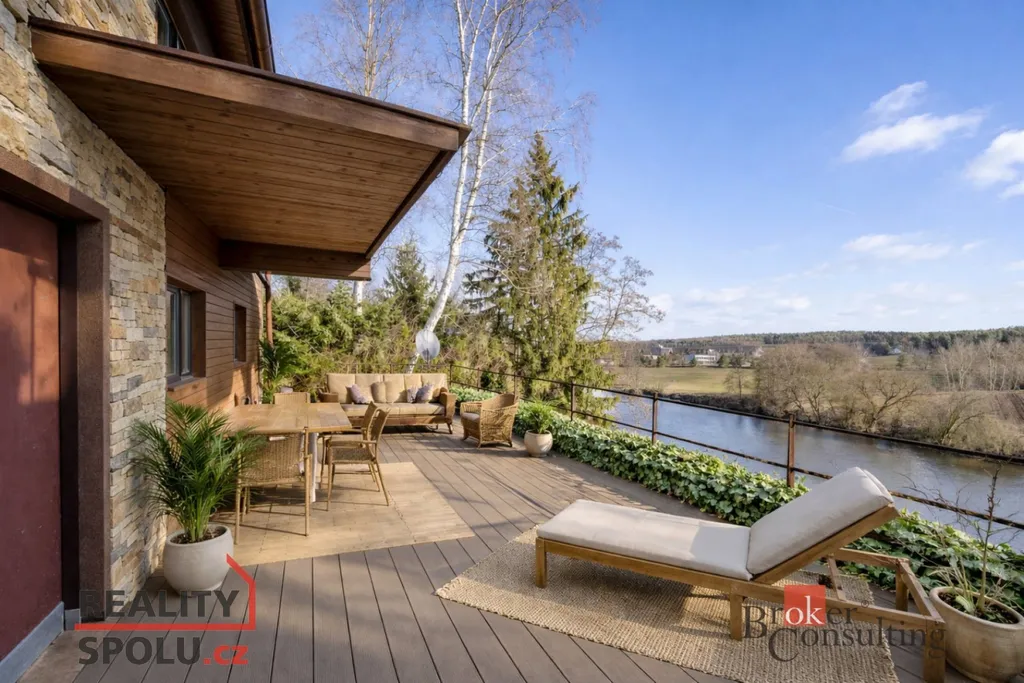 Chata je zapuštěná do svahu a architektonicky řešená do dvou nadzemních podlaží. Vstup do horního podlaží je přímo od příjezdové cesty. Nachází se zde vstupní chodba, otevřený kuchyňský kout navazující na jídelní část a ložnice. Ze vstupní části vede schodiště do spodního podlaží, kde se nachází útulný obývací prostor s přímým vstupem na prostornou terasu, orientovanou směrem k řece. Terasa nabízí nádherné výhledy a je ideálním místem pro relaxaci, posezení s přáteli nebo klidné chvíle u vody.
