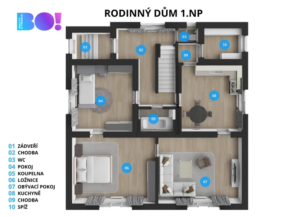Díky tomuto řešení lze uvažovat o vzniku až 3 samostatných bytových jednotek, nemovitost tak nabízí i investiční potenciál.
