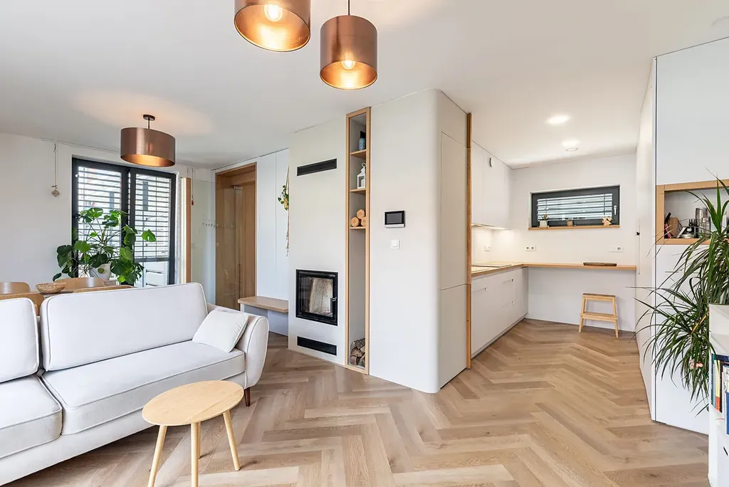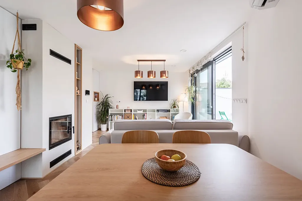 Jde o moderní dům s nadstandardním vybavením, krbem a při využití moderních technologií. V přízemí domu je situován obývací pokoj s kuchyňským koutem a jídelnou, do kterého se vstupuje přes zádveří s vestavnou šatní skříní a policovým botníkem. Pod schody je z chodby přístupné samostatné WC. Z obývacího pokoje je posuvným portálem vstup na členěnou terasu, která navazuje přímo na zahradu, nebo brankou ke dvěma zastřešeným parkovacím stáním. Terasa je vybavena elektricky ovládanou markýzou pro zajištění pohody i v letních měsících. Po schodech z chodby vejdete do 2.np, kde jsou situovány tři pokoje a koupelna s WC. Všechna okna domu mají venkovní, elektricky ovládané žaluzie. Jsou použité vysoce kvalitní materiály. Z použitých technologií Ize jmenovat klimatizaci, centrální rekuperaci vzduchu a víceokruhové elektrické podlahové topení. Střecha domu je připravena na případné dovybavení fotovoltaikou s panely. Videotelefon vč. otevření vstupních dveří Ize ovládat dálkově mobilním telefonem.