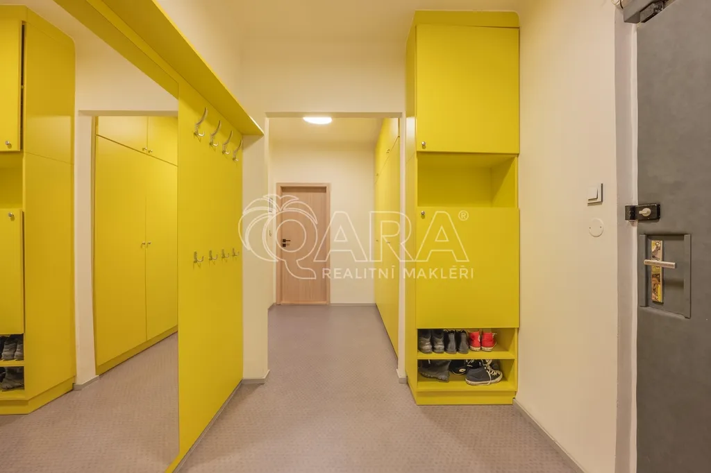 Dispozice bytu nabízí dva neprůchozí pokoje a jeden průchozí - obývací pokoj s kuchyní, což vytváří příjemný otevřený prostor pro trávení společných chvil. V předsíni se nachází praktické úložné prostory, které výrazně zvyšují komfort bydlení. Celkově působí byt velmi světlým, vzdušným a útulným dojmem.