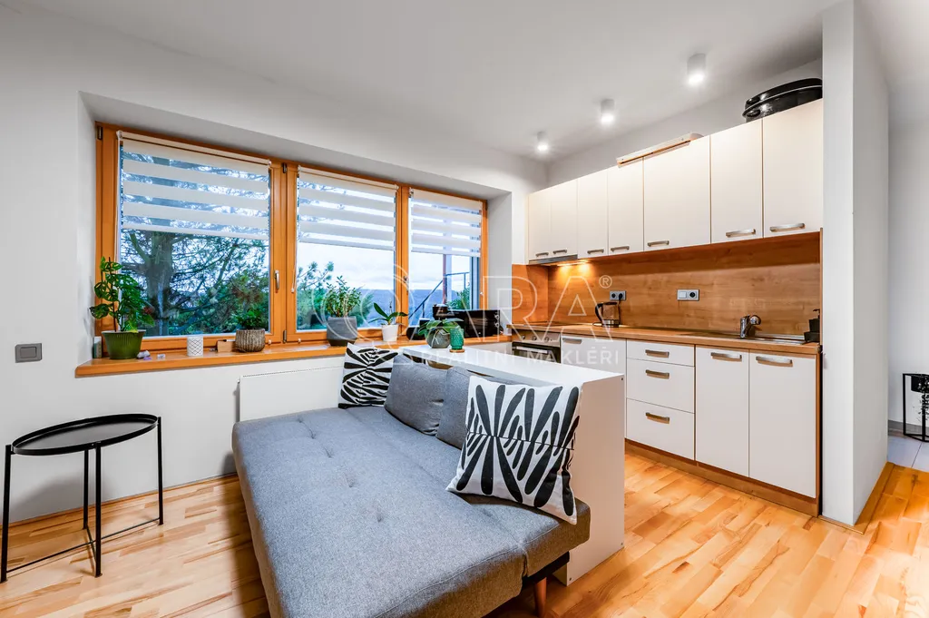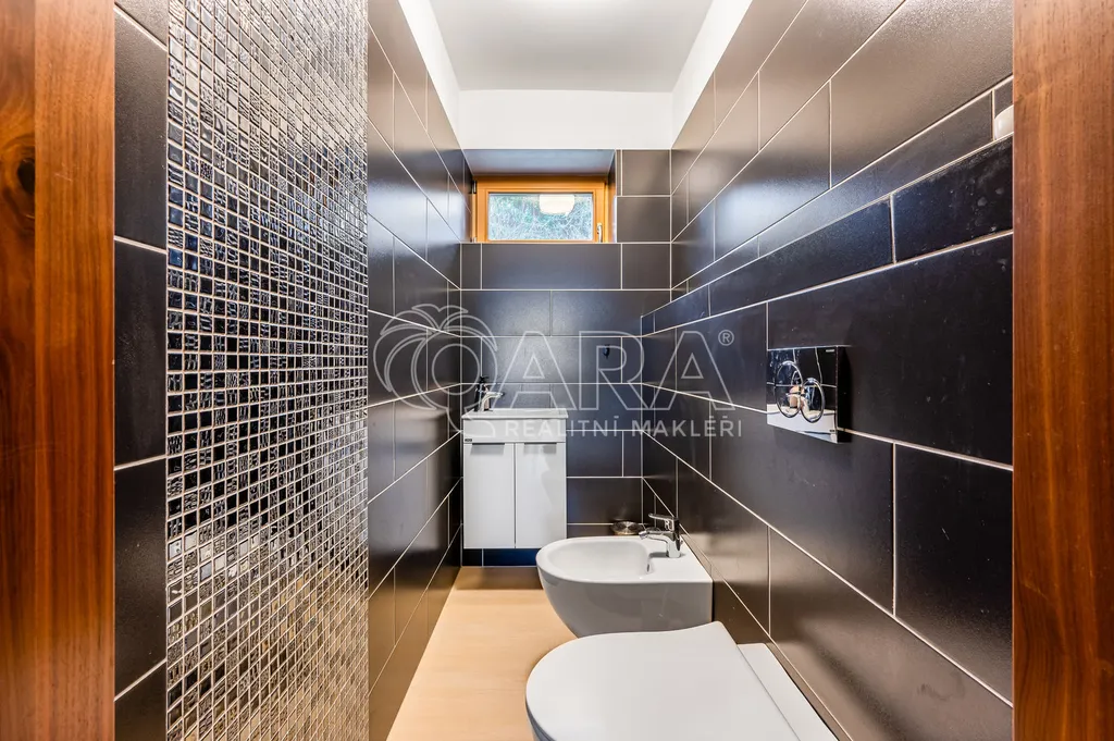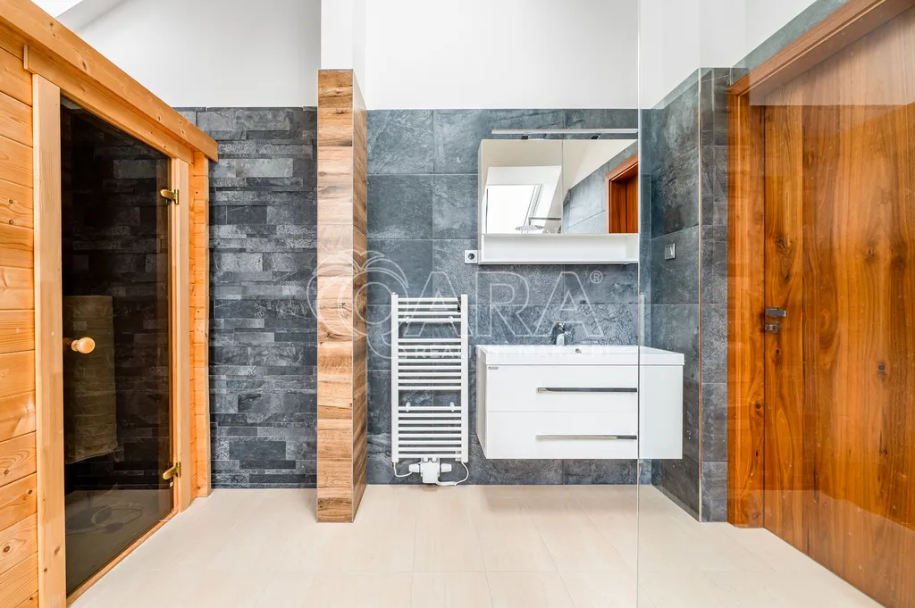 Vila disponuje prostorným přízemím, které nabízí elegantní kuchyň s obývacím pokojem a výstupem na jižní terasu, dále se zde nachází jeden pokoj, 2x šatna, 2x komora, koupelna a toaleta. V prvním patře najdete prostornou ložnici s terasou s nádherným výhledem, vlastní koupelnou se saunou. Další dva pokoje, koupelnu s vanou a sprchovým koutem a samostatnou toaletu. V suterénu domu je prádelna, dvě technické místnosti a sklad.