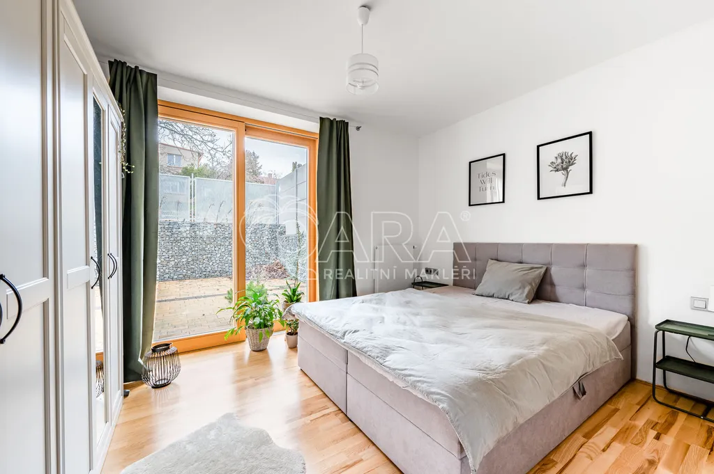 Druhá bytová jednotka má separátní vchod ze zahrady. Dispozice 2kk se skládá z obývacího pokoje s kuchyňským koutem, ložnice s přímým vstupem na vlastní terasu, koupelna a oddělená toaleta.