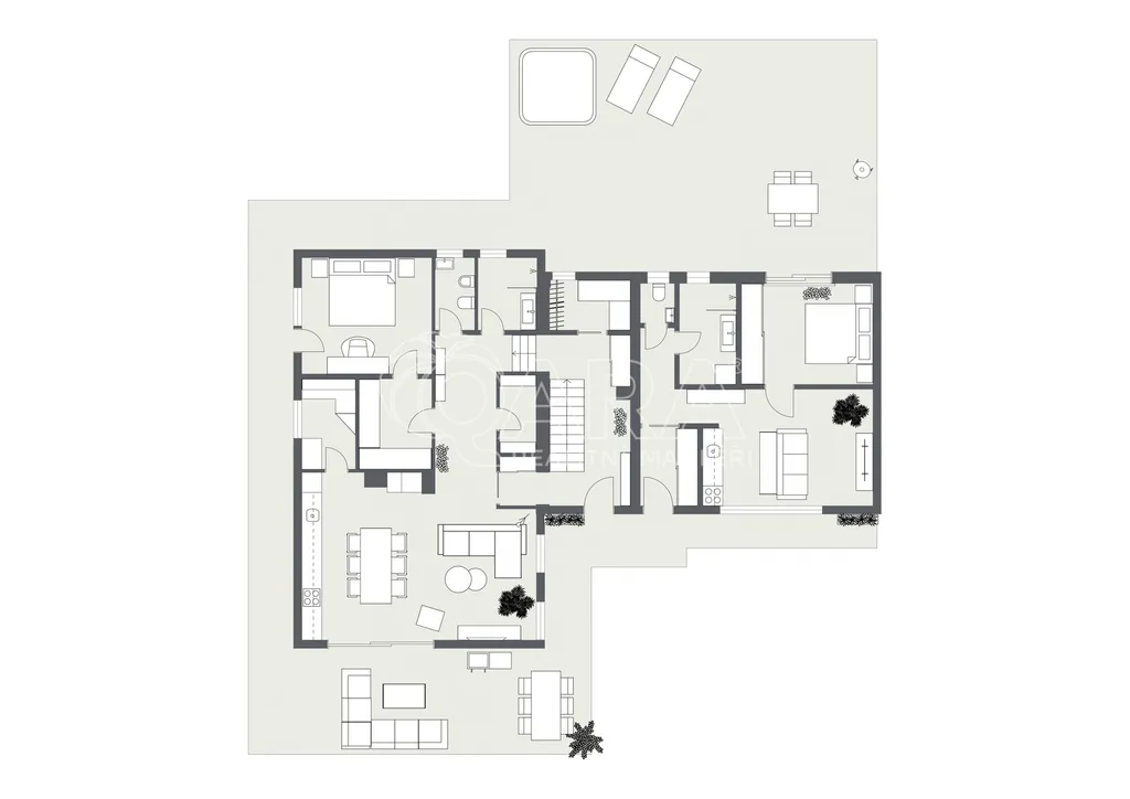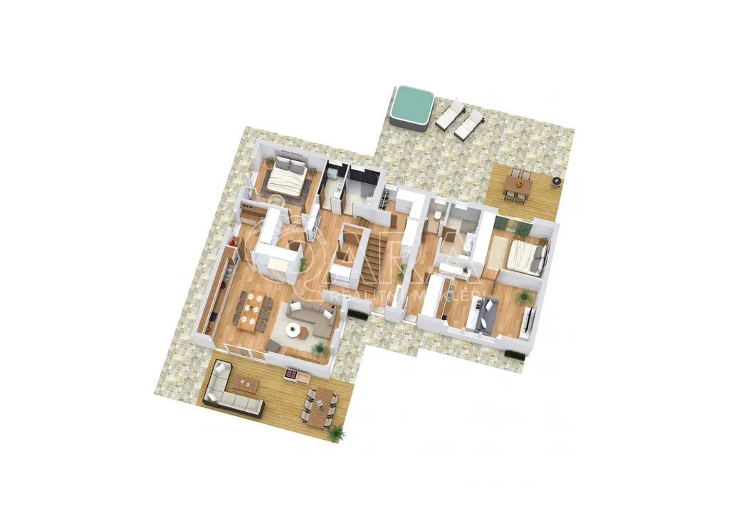 Tato skvostná nemovitost je situována na samostatném pozemku. Vila je vybavena ve vysokém standardu s podlahami z jasanu, skleněnými zábradlími a klimatizací ve všech obytných místnostech. Dům je také vybaven fotovoltaickými panely, centrálním vysavačem, kamerovým systémem a v zahradě je automatická závlaha. Provozní náklady jsou velmi nízké.