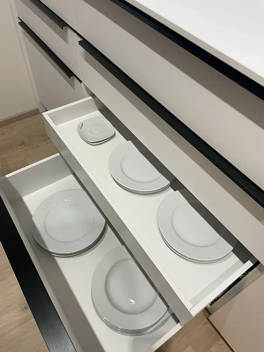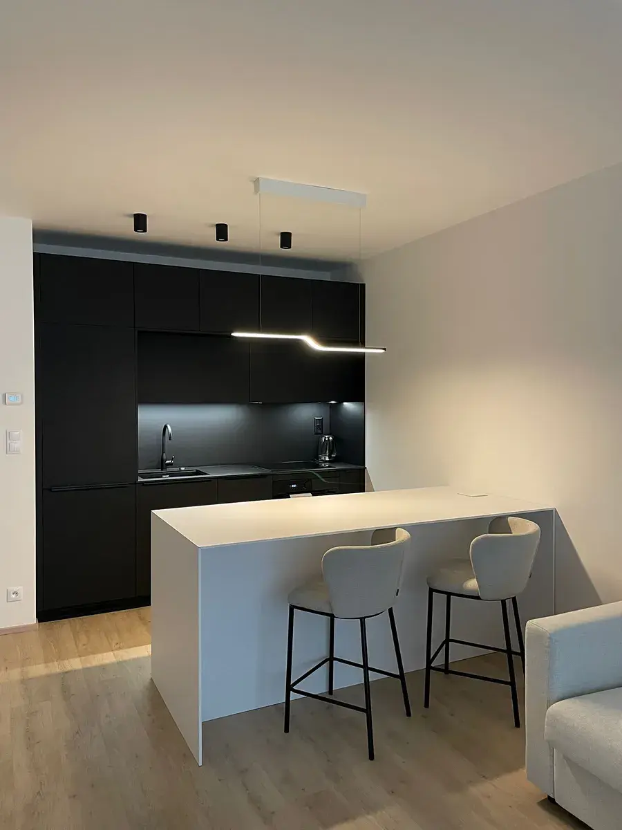 Hlavní obytný prostor tvoří světlý obývací pokoj s kuchyňským koutem a jídelním ostrůvkem. Kuchyň je vybavena vestavnými spotřebiči – lednicí s mrazákem, myčkou, troubou, indukční varnou deskou a digestoří. Použity byly kvalitní materiály a tiché spotřebiče. Podlahy v bytě jsou vinylové, zvolené jako nadstandardní řešení.