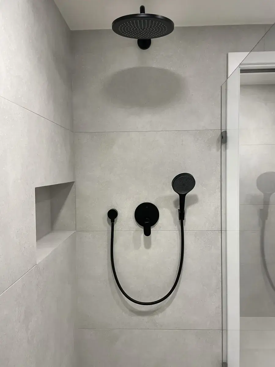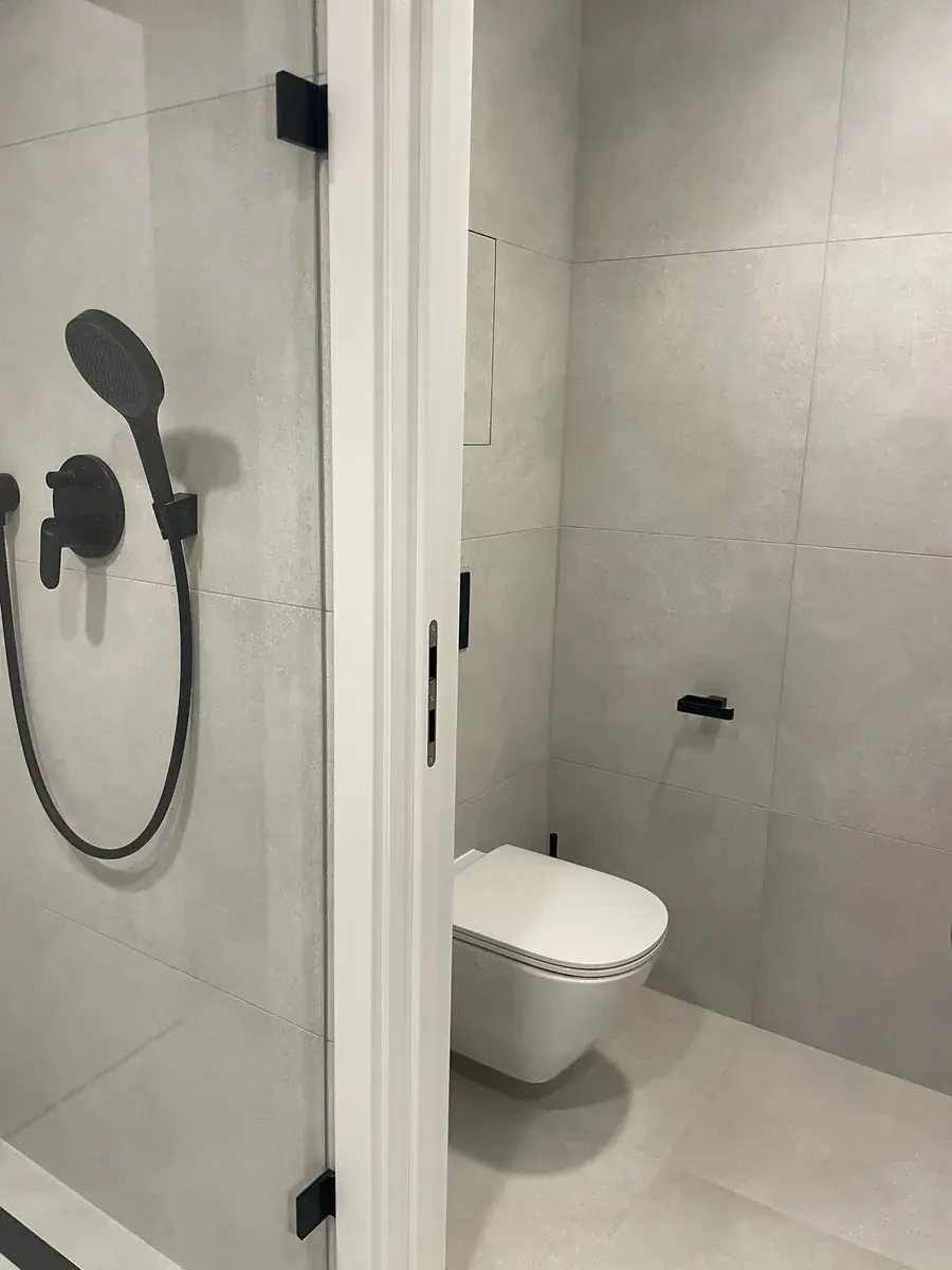 Dispozice bytu je velmi praktická a promyšlená. Vstupní chodba je vybavena vestavěným nábytkem na míru. Z chodby je vstup do komory, která slouží jako úložný i technický prostor – je zde vestavěná skříň, místo na pračku a příprava pro sušičku. Koupelna a toaleta jsou oddělené. Koupelna je provedena v designu Laufen, se zrcadlem s LED osvětlením a komfortním walk-in sprchovým koutem s podomítkovou baterií a tropickou sprchou.