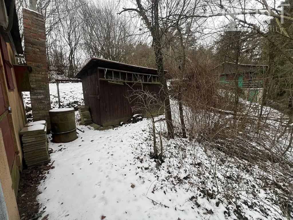Součástí prodeje je také dřevěná kůlna na nářadí, která se nachází za chatkou a poskytuje praktický úložný prostor.
