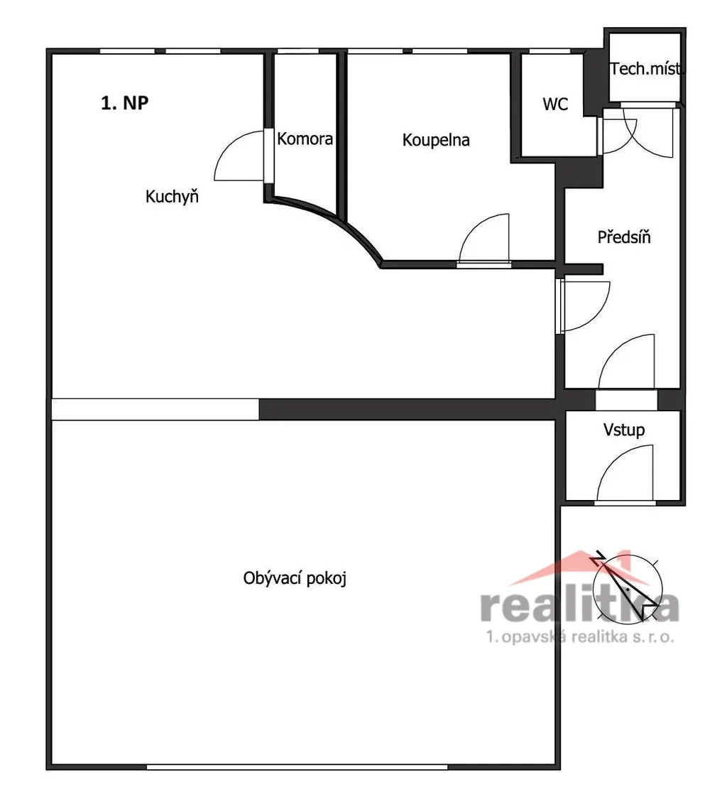 V přízemí domu se nachází vstupní prostor, předsíň, technická místnost, koupelna se sprchovým koutem, samostatné WC, kuchyň a obývací pokoj.