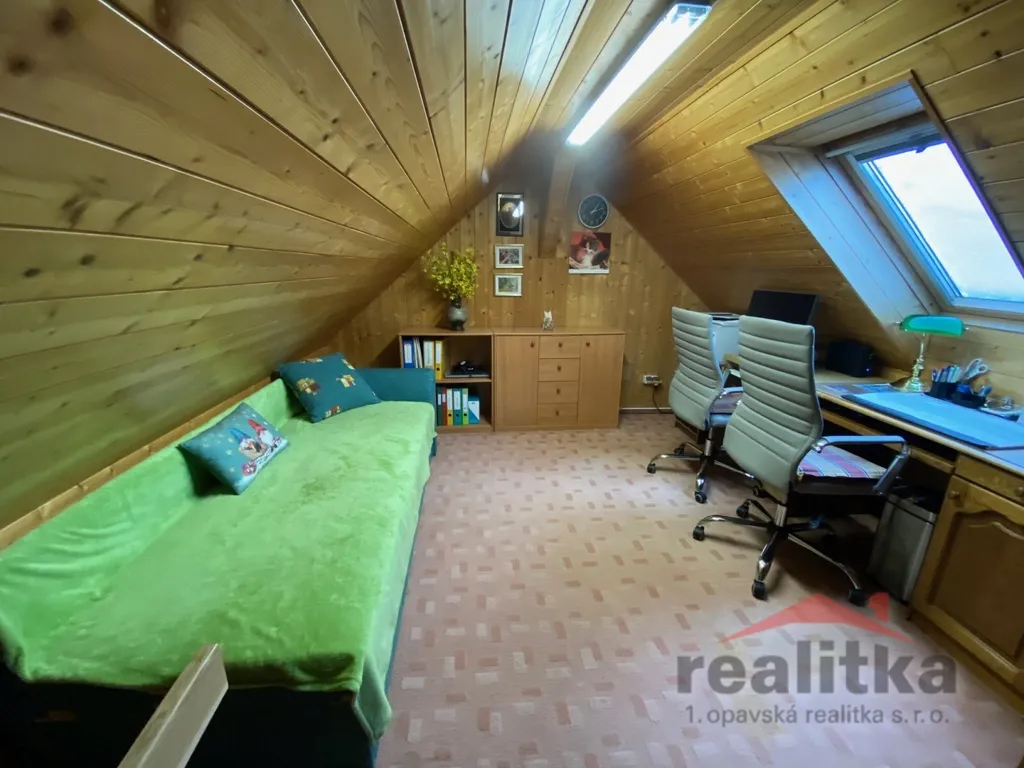V podkroví se nachází další pokoj se šatnou, který lze využít jako pracovnu, pokoj pro hosty nebo dětský pokoj.