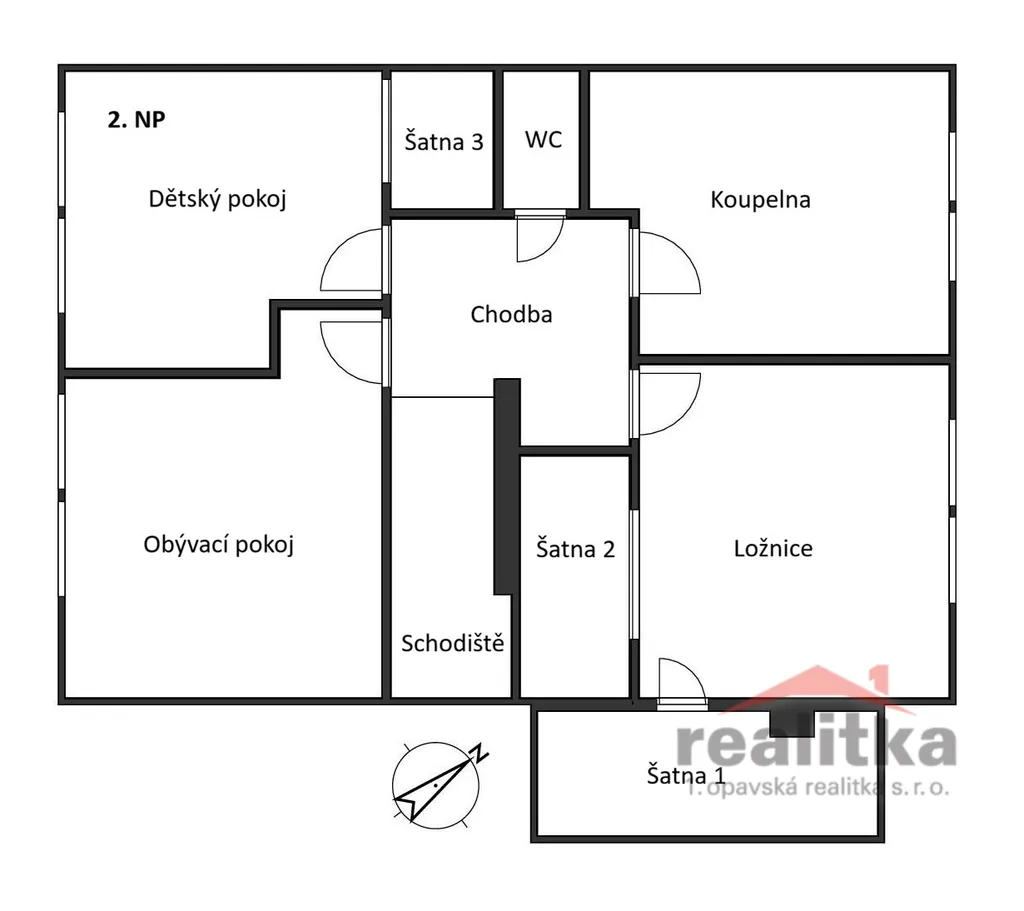 V patře je k dispozici chodba, dětský pokoj se šatnou, ložnice se šatnou, koupelna se sprchovým koutem a samostatné WC.