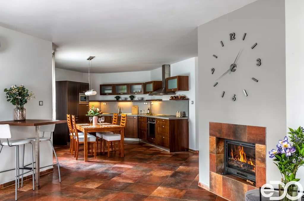 Dům je postavený v roce 2009. Je částečně vybavený nábytkem, kuchyňská linka má všechny vestavěné elektrospotřebiče včetně lednice s mrazákem. Plastová okna s vnitřními žaluziemi a elektricky ovládanými venkovními roletami a částečně s manuálními roletami. Na podlahách je plovoucí podlaha a dlažba, vytápění je řešeno podlahovým topením a radiátory napojenými na elektrokotel. K tomu je v domě krbová vložka s výměníkem a rozvodem tepla do všech místností, ohřev vody zajišťuje bojler. Dispozice nabídne prostorný obývací pokoj s krbem propojený s kuchyní a jídelnou, ložnici, dva dětské pokoje, pracovnu, šatnu, koupelnu s vanou i sprchou, samostatné WC, technickou místnost a přímý vstup z dvojgaráže. U fotografií jsou využity i vizualizace ve velmi nízkém rozsahu.