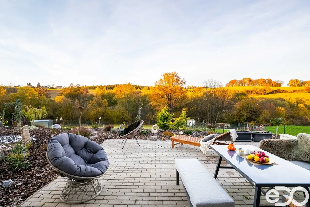 Dům je nízkoenergetický, vytápěný tepelným čerpadlem, s podlahovým topením, rekuperací a elektrickými roletami. Dispozice nabídne prostorný obývací pokoj s výstupem na terasu s krásným výhledem, kuchyňský kout, ložnici, tři další pokoje, koupelnu i technické zázemí. Ať už hledáte další pokoj, klidnou pracovnu nebo vlastní domácí fitness, tady si prostor přizpůsobíte podle sebe. 945 m² zahrady znamená prostor pro děti, bazén, grilování i klidné zahradničení. Mírný svah nabízí možnost vytvořit terasy nebo zajímavé zahradní prvky. Oplocení zatím není realizováno, což dává příležitost zvolit si styl i míru soukromí podle sebe.
