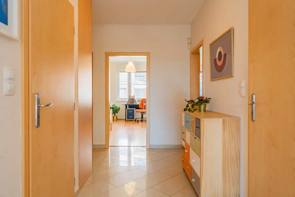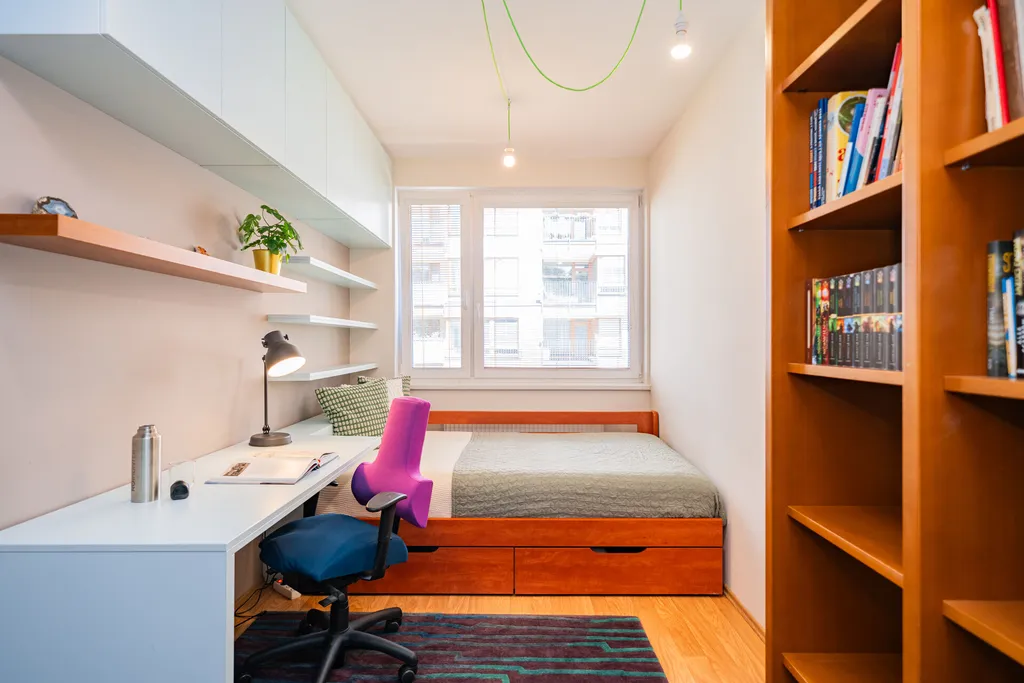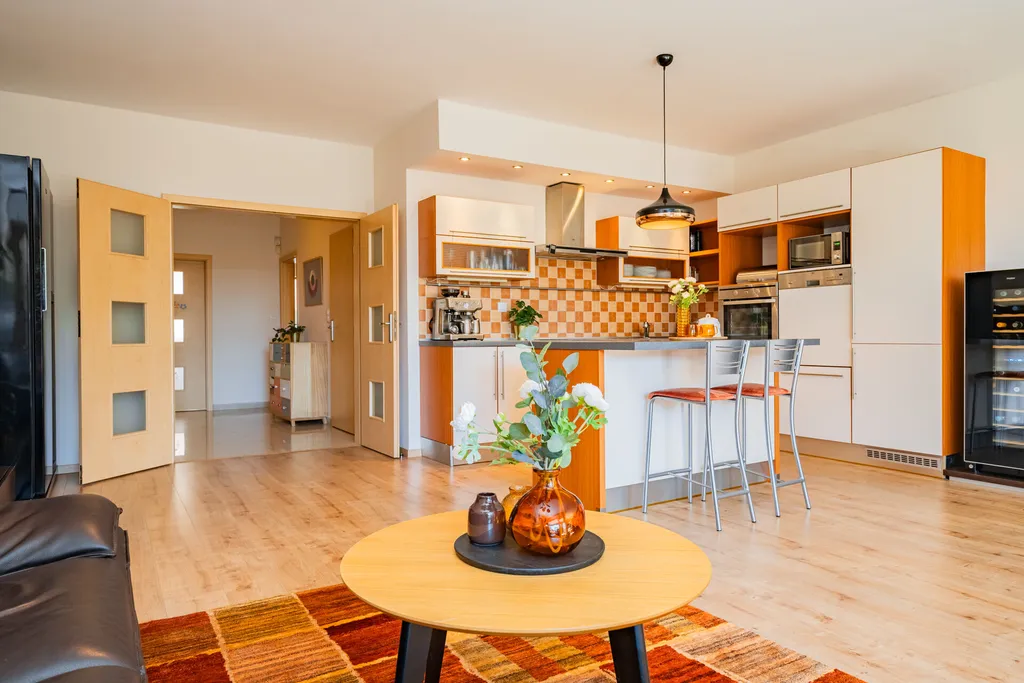 Prostorná dispozice: obývací pokoj se vstupem na lodžii s kuchyňským koutem, tři ložnice, komora i šatna u jedné z ložnic.