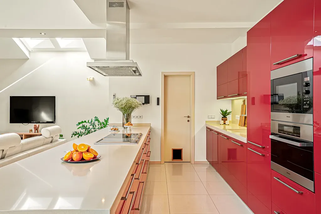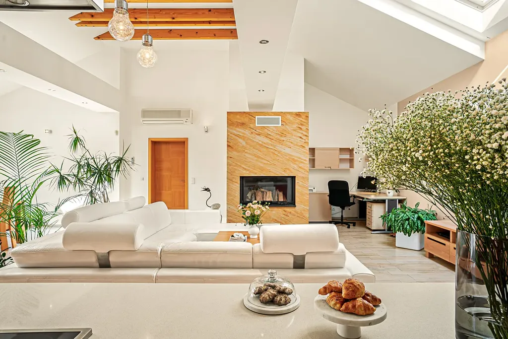 Světlý a vzdušný obývací pokoj s velkým krbem a kuchyňskou linkou značky Hanák s prémiovými spotřebiči Miele, AEG a Electrolux. Mezonetové dětské pokoje nabízejí dostatek prostoru a kreativních možností.