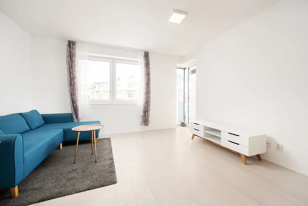 Po vstupu do bytu se nachází předsíň s botníkem a věšákem, která slouží jako centrální rozcestí bytu. Z předsíně je vstup do obývacího pokoje s kuchyňským koutem, který tvoří hlavní obytný prostor. Obývací část je vybavena rohovou sedací soupravou, jídelním stolem a čtyřmi židlemi. Kuchyňská linka na míru je kompletně osazena sklokeramickou varnou deskou, vestavnou troubou, odsavačem par, myčkou, lednicí s mrazákem, dřezem, kuchyňskou baterií a LED podsvícením. Z obývacího pokoje je přímý vstup na balkon, orientovaný do klidného vnitrobloku. Z boční strany se nachází okolní zástavba, čelním směrem je otevřený výhled na hrad Špilberk. Balkon je vybaven dvěma dřevěnými židlemi a venkovním stolem a nabízí příjemné místo pro posezení.
