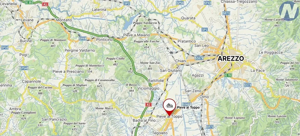 Pieve al Toppo leží v malebném údolí Val di Chiana, nedaleko historického města Arezzo. Lokalita Civitella in Val di Chiana je proslulá svou historií, vynikajícím vínem a olivovým olejem. Dům se nachází v bezprostřední blízkosti veškerých služeb, jako supermarket, lékárna i autobusová zastávka, jež jsou doslova za rohem, přesto si však uchovává intimitu rezidenční zóny u parku.