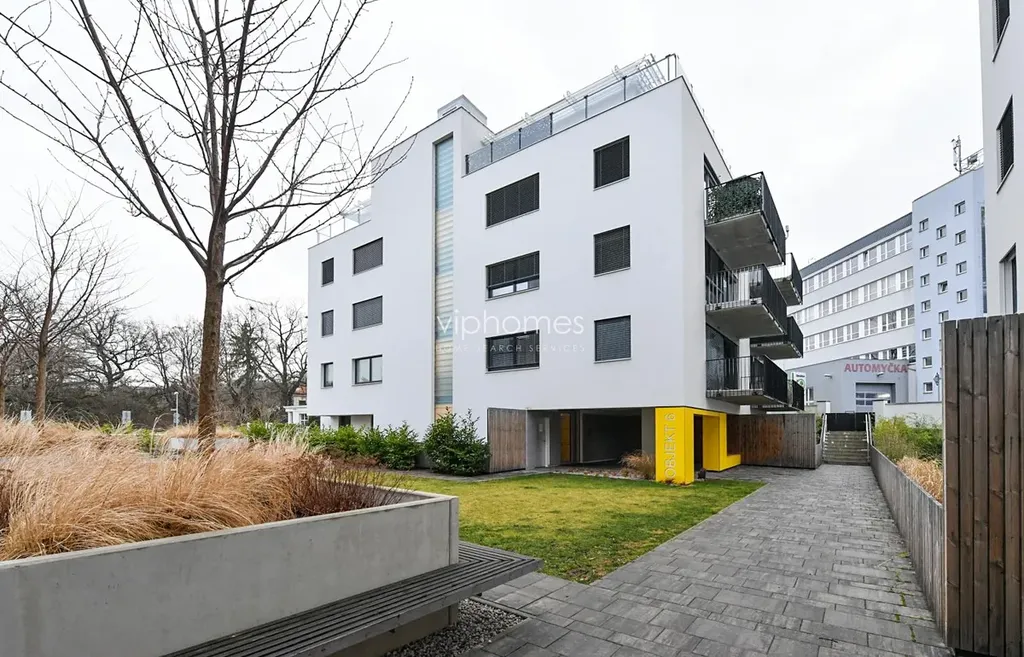 Byt s obytnou plochou 106 m2 sestává z prostorného obývacího pokoje s plně vybaveným kuchyňským koutem a přístupem na terasu, tří ložnic, (jedna s balkonem), šatny,komora, dvou koupelen (vana/sprcha) a samostatné toalety. Dostatek úložných prostor, vestavěné skříně, dřevěná okna a podlahy, videotelefon, bezpečnostní vstupní dveře. Podzemní parkování, sklepní skladovací místnost, SAT, telefon.