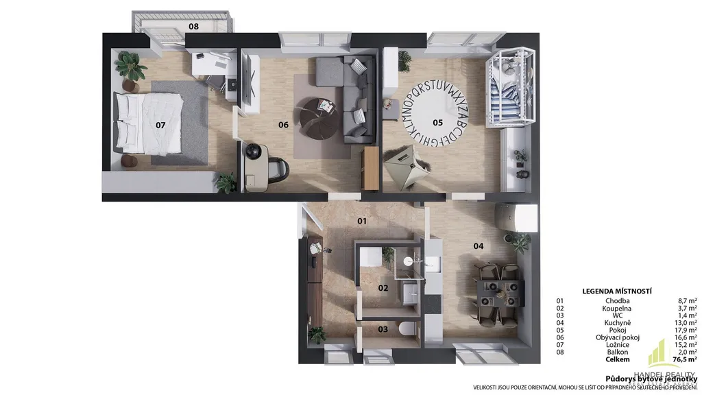 Dispozice bytu je velmi praktická: samostatná kuchyně, prostorný obývací pokoj a dvě ložnice, přičemž jedna z ložnic má přímý vstup na balkon. Díky tomu je byt vhodný jak pro rodinné bydlení, tak i pro investiční využití.