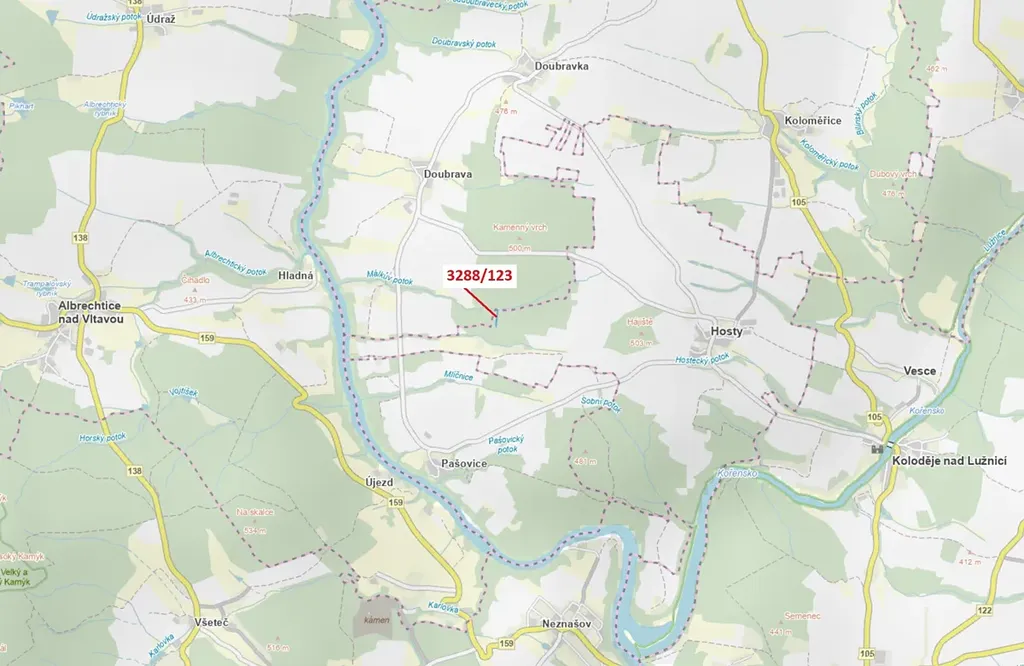 Lesní pozemek o výměře 1707 m2, parcelní číslo 3288/123, podíl 1/1, katastrální území Hosty, obec Hosty, obec s rozšířenou působností Týn nad Vltavou, okres České Budějovice, Jihočeský kraj. Částečně po těžbě.