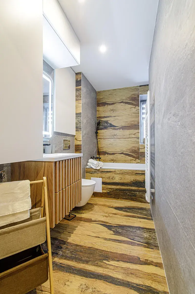 Koupelna s oknem včetně obkladů a dlažby, které k sobě ladí, nová sanita, prostor na umístění pračky.