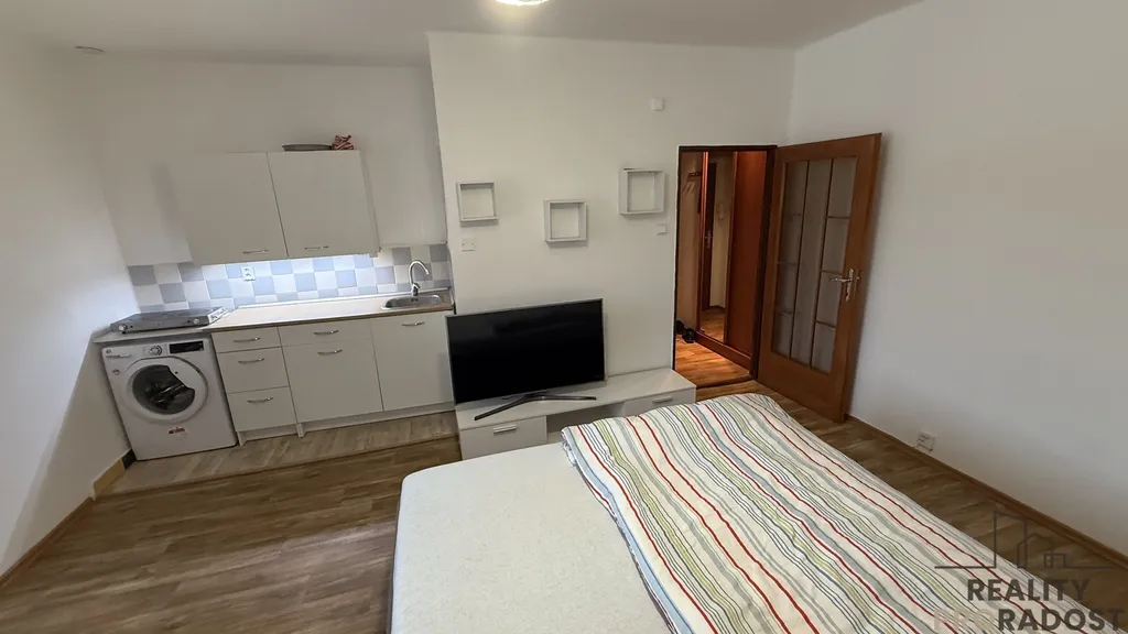Součástí vybavení je moderní kuchyňská linka s pračkou a s varnou deskou. Byt je světlý, útulný a připravený k okamžitému nastěhování.