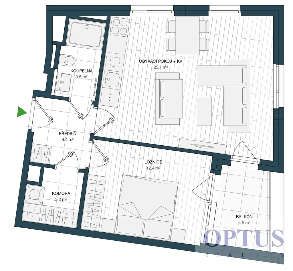 Byt tvoří obývací pokoj s plně vybaveným kuchyňským koutem (25,7 m2) a se vstupem na lodžii, ložnice (12,4 m2) rovněž se vstupem na lodžii, koupelna se sprchovým koutem s podomítkovou termostatickou baterií a s WC, komora s přípravou pro pračku / sušičku a předsíň.